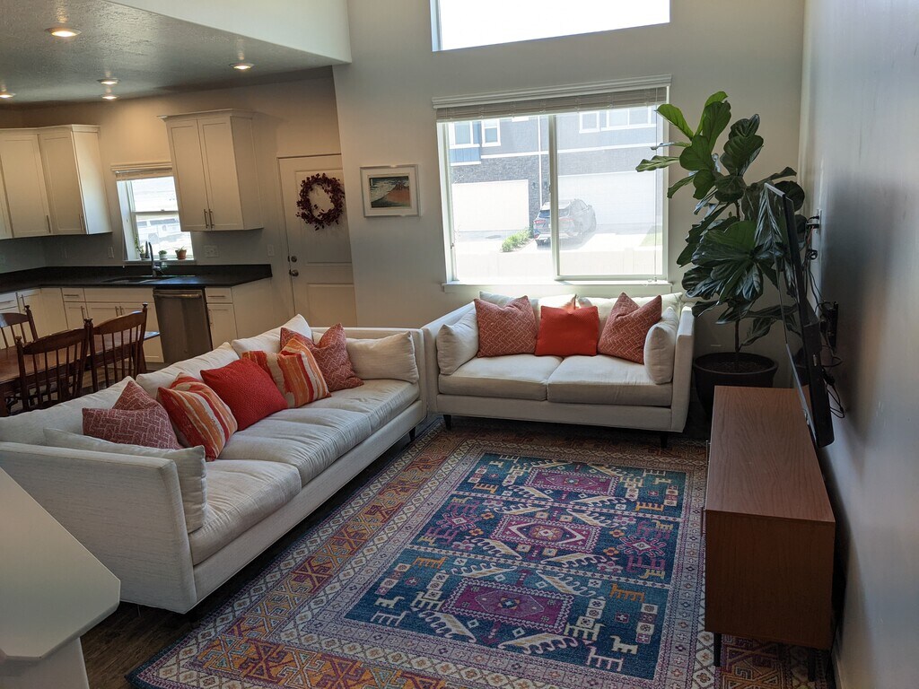 *You will have the option to take over the current lease, which will be 2/1/25 - 7/4/25 OR you can sign a one year lease and keep the current rent price for a year. We are renting our townhouse- Built in 2018, it has 4 bedrooms, 3.5 Bathrooms, Approx 2050 sq ft. One owner, beautiful mountain views, all the grocery shopping you’ll need within 10 minutes (Ridley’s, Smith’s, Costco, Walmart). Within walking distance to parks and elementary school. Includes kitchen with stainless steel appliances, dishwasher, microwave, refrigerator, gas range/oven. Living room area sports vaulted ceilings creating a spacious and comfortable space. Quartz counter-tops throughout the home. Laundry area conveniently located upstairs near the bedrooms with washer, dryer included. Spacious private patio and access to the community swimming pool. The master bedroom includes his and her closets and the unit has a finished basement with plenty of extra space. 2-car garage with overhead storage.