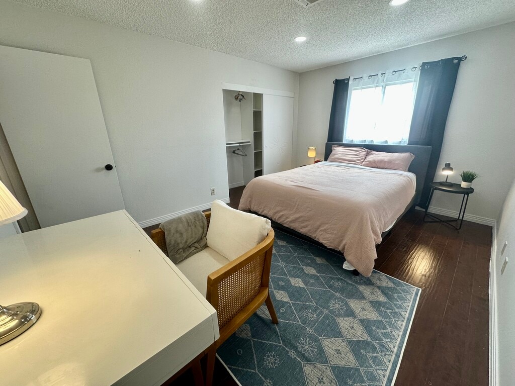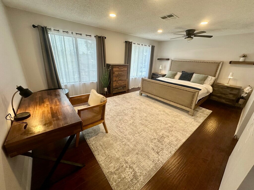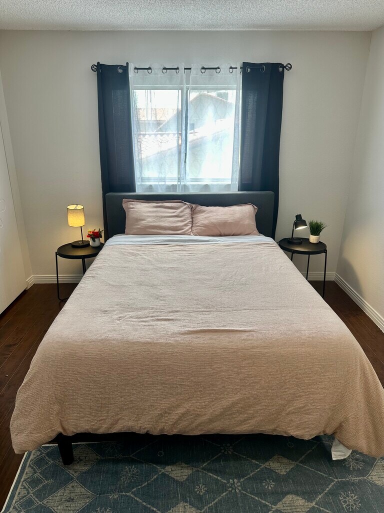Private bedroom with shared bathroom with 1 more room only King size bed, Tempur-pedic memory foam Located ground floor, lot of natural light and sun in morning All bedroom doors in house can be locked inside and out Large dining for 6 guests inside and outside Free and easy to find street parking Fast charger for any Electric vehicle on demand and fee Fully equipped kitchen with all appliances The space Free Fast WIFI Desk and chair in bedroom Large closet space with lot of drawers Central AC in all rooms Washer and dryer in unit for monthly stays 60$ cleaning is charged every month directly, and insure cleaning of common areas twice a month No pets allowed