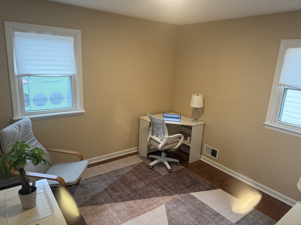 The room for rent has 2 closets and an attached bathroom with access to a 3rd closet (storage space) for your personal use. The entire apartment is spacious with beautiful natural light. The place is set up in a way that each flatmate can enjoy one's personal space without being confined to one's respective room. The home-office is a plus- as one can work from home in comfort. The apartment share is located in a neighborhood that is super quiet and peaceful, it is a perfect place to recharge after a busy day of work.