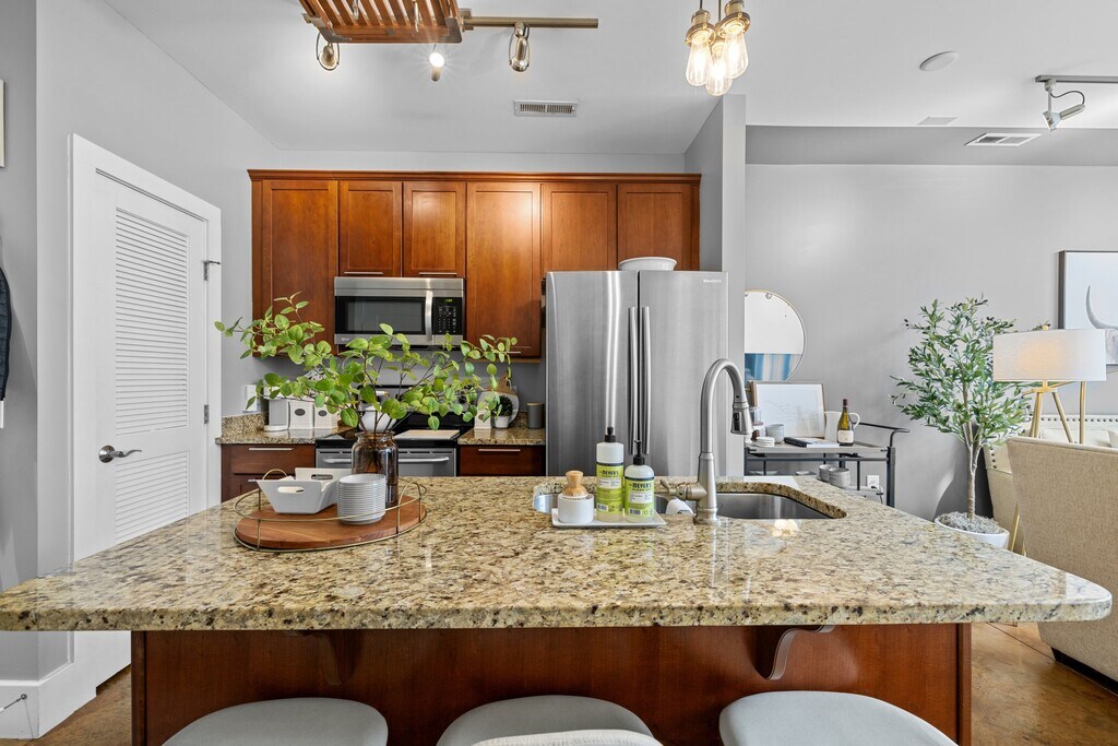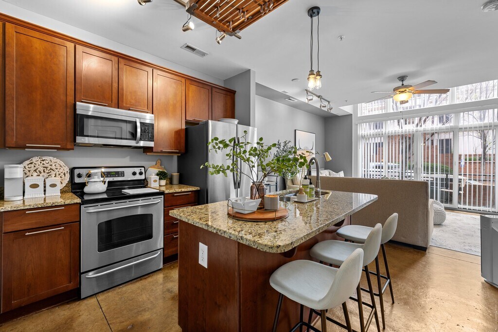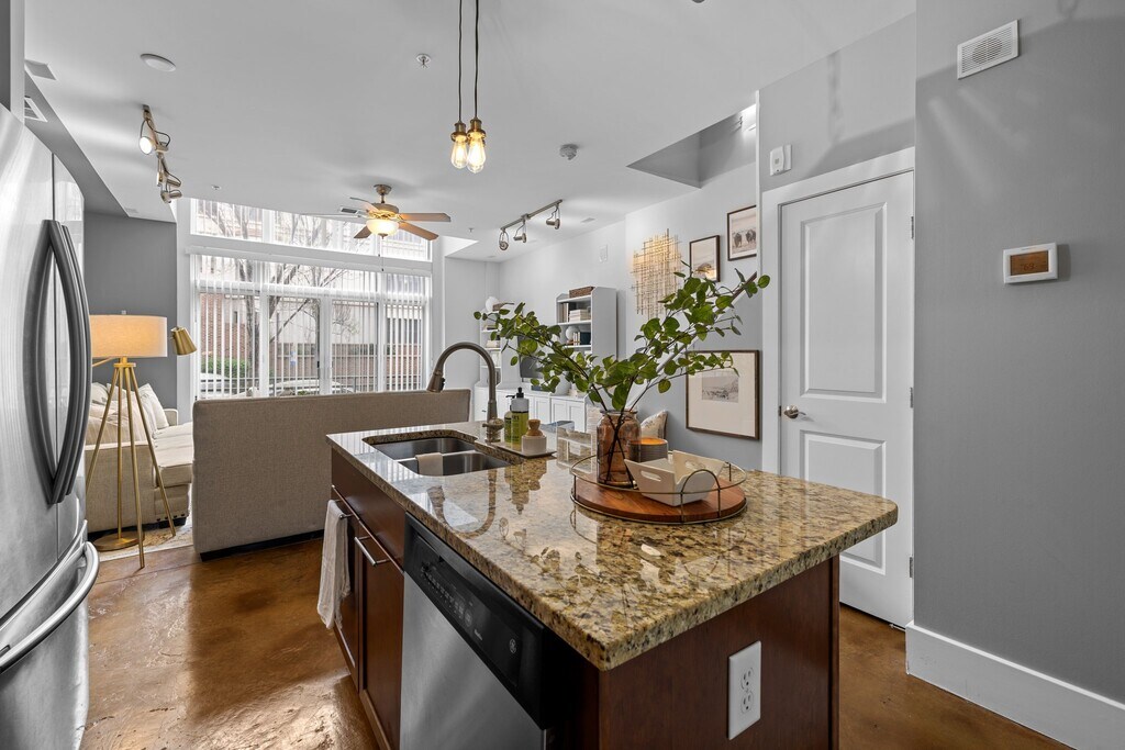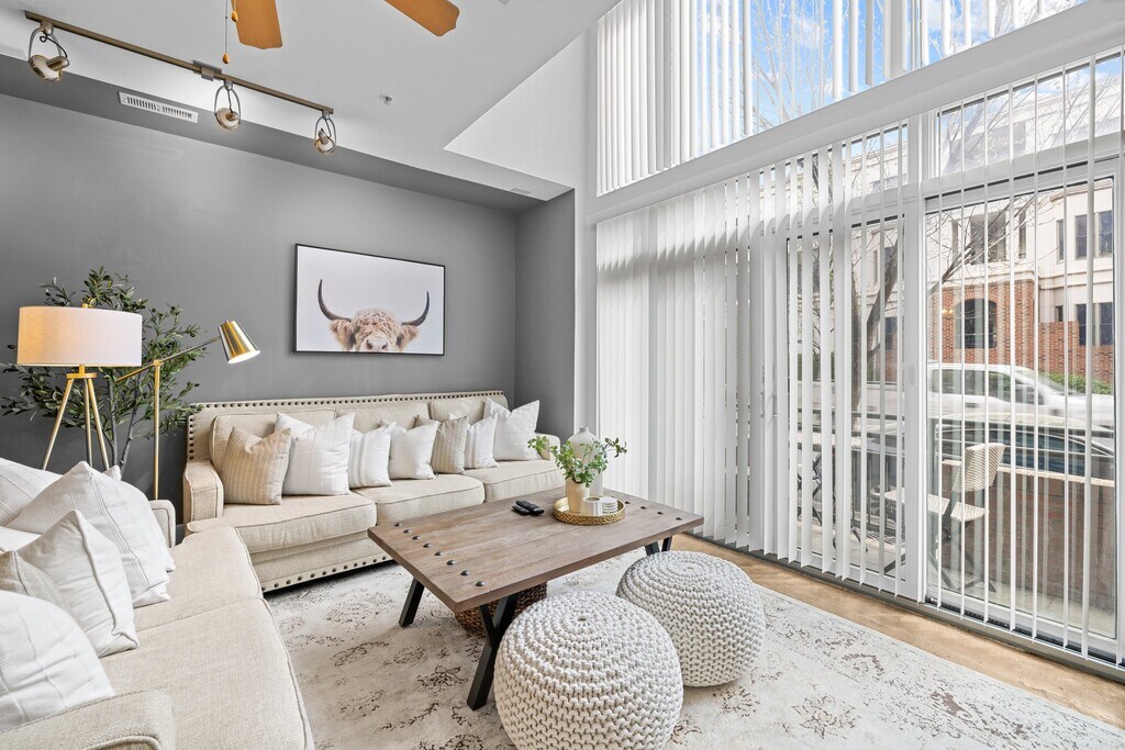Come enjoy the peak of Downtown living! Modern 1 bedroom, 1.5 bathroom, 2 story condo loft in the Palladium Plaza in Downtown Raleigh. This condo is 2 stories and 1100 square feet. You won't find a larger one bedroom unit in Downtown. The building is right in the middle of everything downtown has to offer and is attached to Red Hat. It is adjacent to Fayetteville Street, City Market, and an R Line stop which provides transportation to all of downtown including Glenwood South, the Convention Center, Red Hat Amphitheater, and the Capital District. The first floor of the condo has a modern, open floor plan with granite countertops, stainless steel appliances, stained concrete floors, a half bath, floor to ceiling windows, and a balcony with plenty of space for a bistro table and chairs to enjoy people watching over Blount Street. The second floor consists of a large master suite loft with a glass wall, floor to ceiling windows, a tile bathroom with double sinks and 3 closets, including a large walk in closet. There is a second floor full size washer and dryer in the unit. There is one included parking space in the parking deck attached to the building. 12 month lease preferred, however, shorter lease terms and pets are negotiable. Unit is available February 16, 2026.
