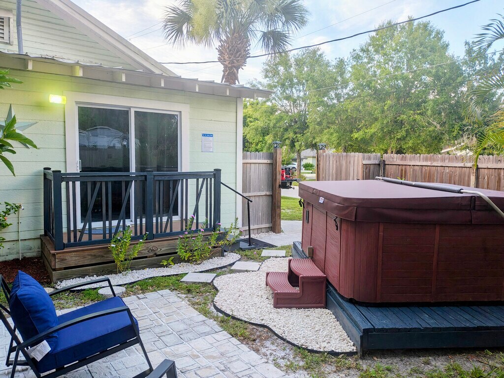 This cozy Cottage is a 1/1 in Winter Haven Fl. Walk to downtowns restaurant and local shops and breweries. Close to Legoland. Short term unit with small kitchenette. Fenced yard with private spa. This home is set up for short term rental and has kitchenette with Convection Microwave, coffee pot, and all dishware. Washer Dryer, queen bed, TVs in the living room and bedroom. This is a duplex unit. Split 1920 home.