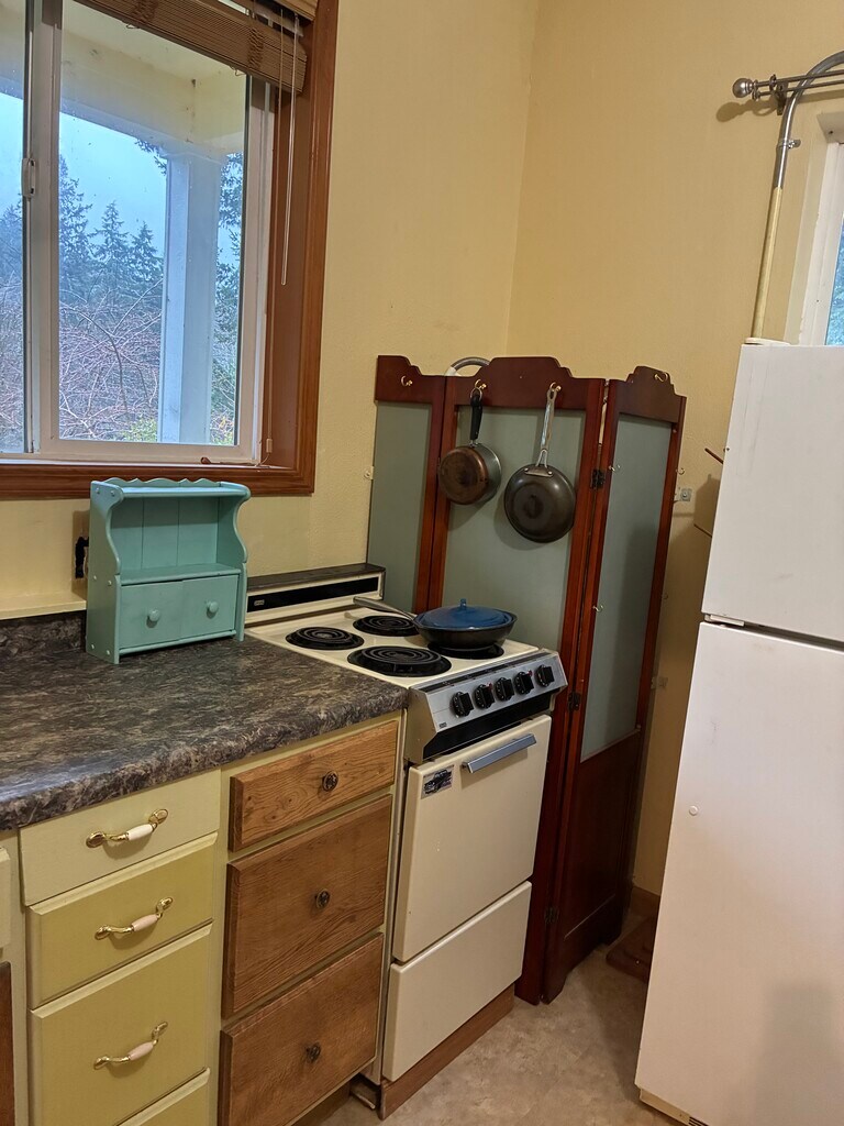 This is a 3 room in-law apartment on our 11 acre property. Outside features: forest and meadow, year round creek behind the house and beautiful Schooner Creek across the road, shared sunny front porch, large fenced in garden, fresh air, peace and quiet! This property is 5 miles east of town, so we are sheltered from most of the fog and high winds blowing in from the ocean, but we are only a ten minute drive to the beach! Shopping is about 20 minutes away. This fully furnished apartment has a kitchen with full sized fridge, a bedroom bathroom ensemble ( see photos), and a living room with a sliding door, which is also your own private entrance. There is a shared laundry. My daughter and I are peaceful and considerate, and we are looking for a like minded person to share our property. Please also be reliable, solvent, and a fairly good housekeeper. The rent will be month to month, with the possibility of a more permanent arrangement at the end of the summer. The monthly rent includes all utilities except for cable tv. We offer high speed internet via Starlink, good well water, and your own private landline, electric garbage sewer, and parking by your front door. We have four indoor/ outdoor pets, three cats and a large bunny, but we’ll consider an indoor pet, with an additional refundable $150 pet deposit! Move in requirements: first and last months’ rent, $500 refundable cleaning/damages deposit, proof of income, personal references and a reference from your last living situation and a minimum credit score of 600. Please get in touch, and tell us a bit about yourself! Thank you