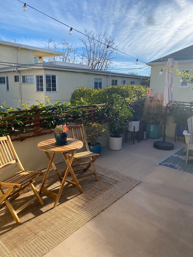 The apartment is in a garden courtyard bldg.in a quiet neighborhood within walking distance of Ocean Park and Montana Ave. business center. Is in a quiet building and being on the top floor of a two story building offers wonderful natural light and comes with a shared deck.