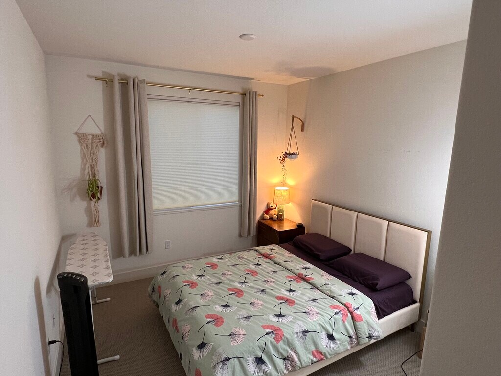 Townhouse-style condominium house available for rent in south Fremont near WARM SPRINGS BART station. The house is a 2200 sqft 3 bed and 3 bath. It has a private entrance from the street, a very large walk-in coat closet, tandem 2-car garage. The living space includes Living, Kitchen, Dining, Pantry, Laundry, Guest Bedroom, Guest bathroom, Master bedroom, master bath and a walk-in closet. A lovely, elevated loft with a bedroom, walk-in closet and attached bathroom. All closets have shelves furnished for maximum storage capacity. EV charger NEM 220V 32 Kwh outlet available in the garage. The house is right across Lila Bringhurst Elementary school, 7 min walking distance to Warm Springs BART and 7min driving distance to Grocery & shopping, 7 min to Pacific Commons Shopping center (Costco, Target, Cinema, Kohls) and many restaurants. This townhome-styled condominium is newly built by Lennar and part of the 'Innovation' community in Fremont, California. I'm the owner. It has 2 floors, with the main floor having a high ceiling that creates a spacious and luxurious feeling. The main living area has a large number of windows that lead to having continuous sunlight through the day. The home comes with a modern oven, microwave, fridge, washer and dryer, ring security sensors for security. The garage is tandem and has extra room that can be used as storage. There is lvp-flooring in the living area, and carpet elsewhere. The kitchen has quartz countertop and an array of cabinets that cover 1 whole wall. The home is part of the 'Innovation' community. It is across a huge park, which is very vibrant. The amenities of swimming pool, clubroom, fitness center, barbeque grills, playground, basketball courts, and open-seating areas are part of this community and are free to use. The utilities (internet, pg&e, water, trash, sewage, and appliance maintenance plan) will be paid separately from the rent. The bills for these services will be sent to the renters at the beginning of every month. The upper floor has a loft and a bedroom (bedroom comes with its own bathroom), both having extra privacy. The loft is great for creating a game room, office, gym, or a mini theater. This is the bedroom being rented. Please inquire for any questions or more details.
