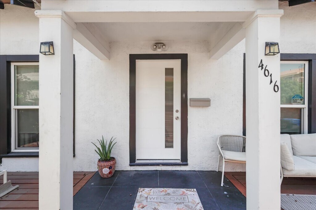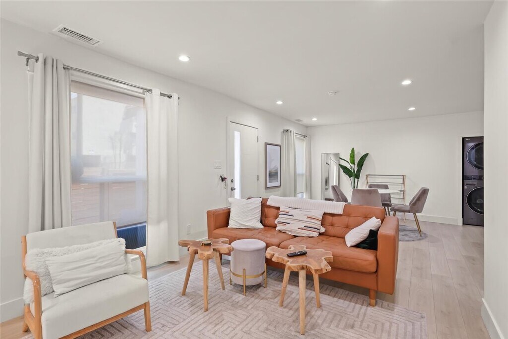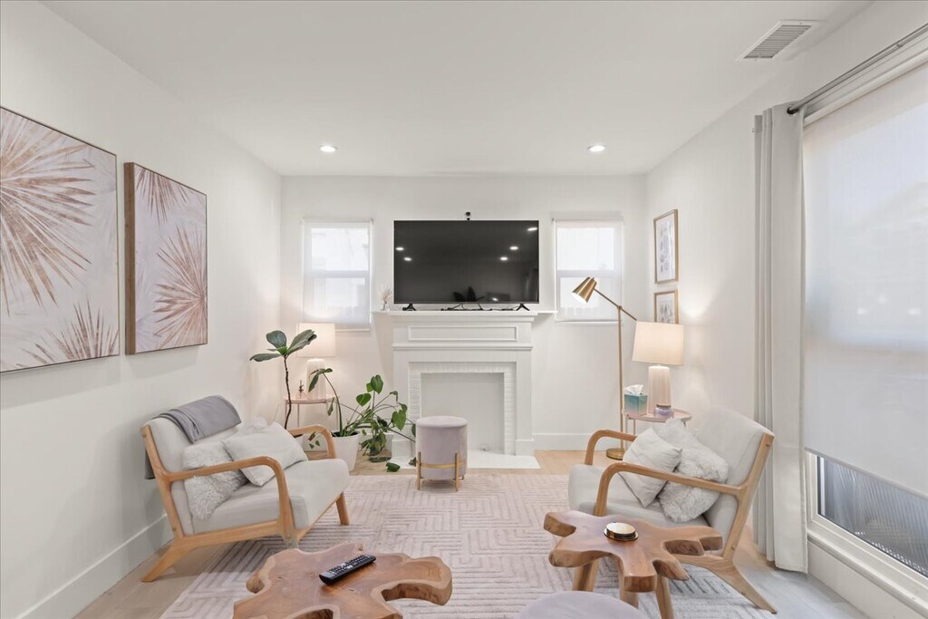 This beautifully remodeled and fully fenced Mid-Wilshire residence offers a rare combination of space, versatility, and modern comfort. Featuring three bedrooms and two bathrooms on the main level, plus a converted attic bonus suite with its own bathroom, kitchenette, laundry, and separate entrance, the layout provides flexibility for a variety of living arrangements. The upper level’s bonus suite is ideal for extended stays, creative work, or personal retreat and may also be reopened as a loft area to connect with the main living space in the future. Inside, an abundance of natural light enhances the open-concept floor plan. The inviting living room features a cozy fireplace and flows seamlessly into a dedicated dining area and chef’s kitchen—perfect for daily living or entertaining. The kitchen showcases a large center island, quartz countertops, stainless steel appliances (refrigerator, range, dishwasher, and microwave), and generous cabinetry for storage. The primary suite includes a private bath, while two additional bedrooms share a stylish full hallway bathroom. Thoughtful upgrades throughout include durable vinyl plank flooring, recessed lighting, dual-pane windows, central heating and air conditioning, a tankless water heater, and in-unit laundry for convenience. Outdoors, enjoy a private wood deck for gatherings or quiet relaxation. The property also offers gated driveway parking for up to three vehicles. Located in sought-after Mid-Wilshire, this home provides easy access to Paramount Studios, Larchmont Village, Hollywood, Wilshire Country Club, Koreatown, DTLA, and the 101 Freeway. A combination of turnkey comfort, modern design, and exceptional convenience in one of Los Angeles’s most desirable and centrally located neighborhoods.