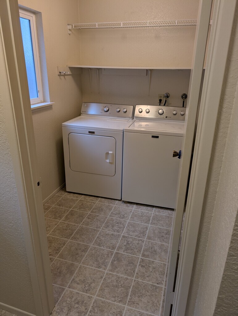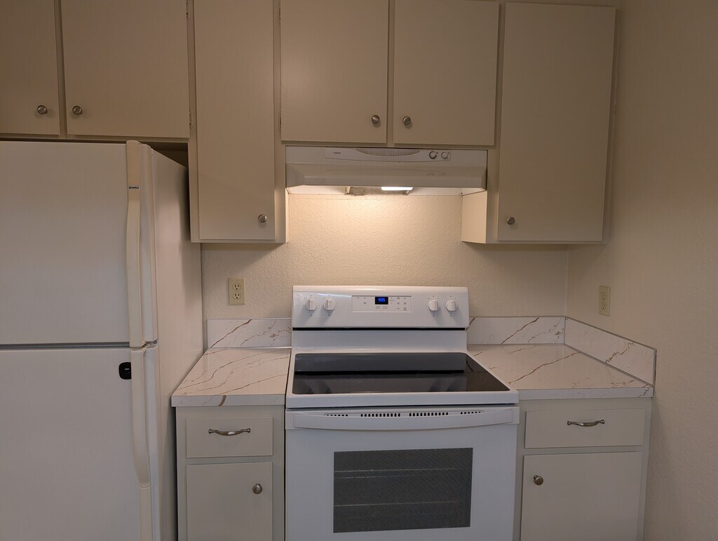 This unit has just been renovated with new countertops, sinks and faucets. New carpet, paint and toilet. This is a townhouse with the main living area on the first level, including laundry room and half bath ,and the two bedrooms and full bath upstairs. This unit has ample storage, including a laundry room, under the stair closet, linen closet upstairs, and a storage unit outside. The king size master bedroom has a vanity area, walk-in closet, and a separate closet. The second bedroom is large enough for a queen size bed and has a very large closet.