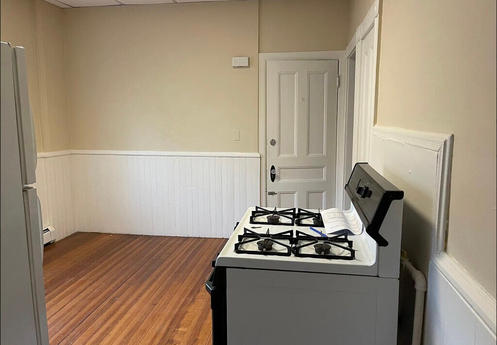 This spacious 1st floor apartment is part of a two unit building which was converted from a single family. It has 1 bedroom, a living room, an eat-in kitchen, and pantry. There are beautiful hardwood floors. Also, included is a gas stove and a refrigerator. A walk-in closet off the living room for use as well as storage in the area near the side extrance. Off-street parking for 1 car is available and a small welcoming yard. Easy to get to and close to stores and highway and it is on the bus line. NO lease is required to move in! NO utilities included. NO pets or smokers. This is a month to month rental with no written lease. Utilities are not included.