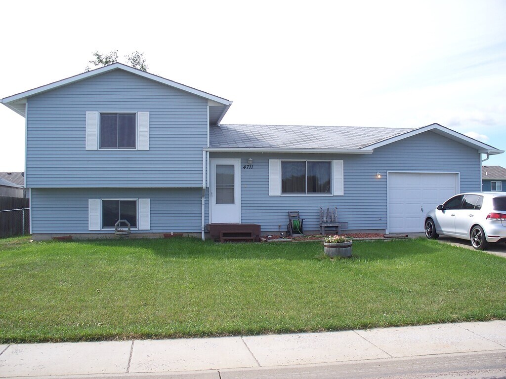 For rent starting April 1st: a split-level, 3-bedroom, 2-bath house. It features an attached insulated garage and a fully fenced backyard with a shed.