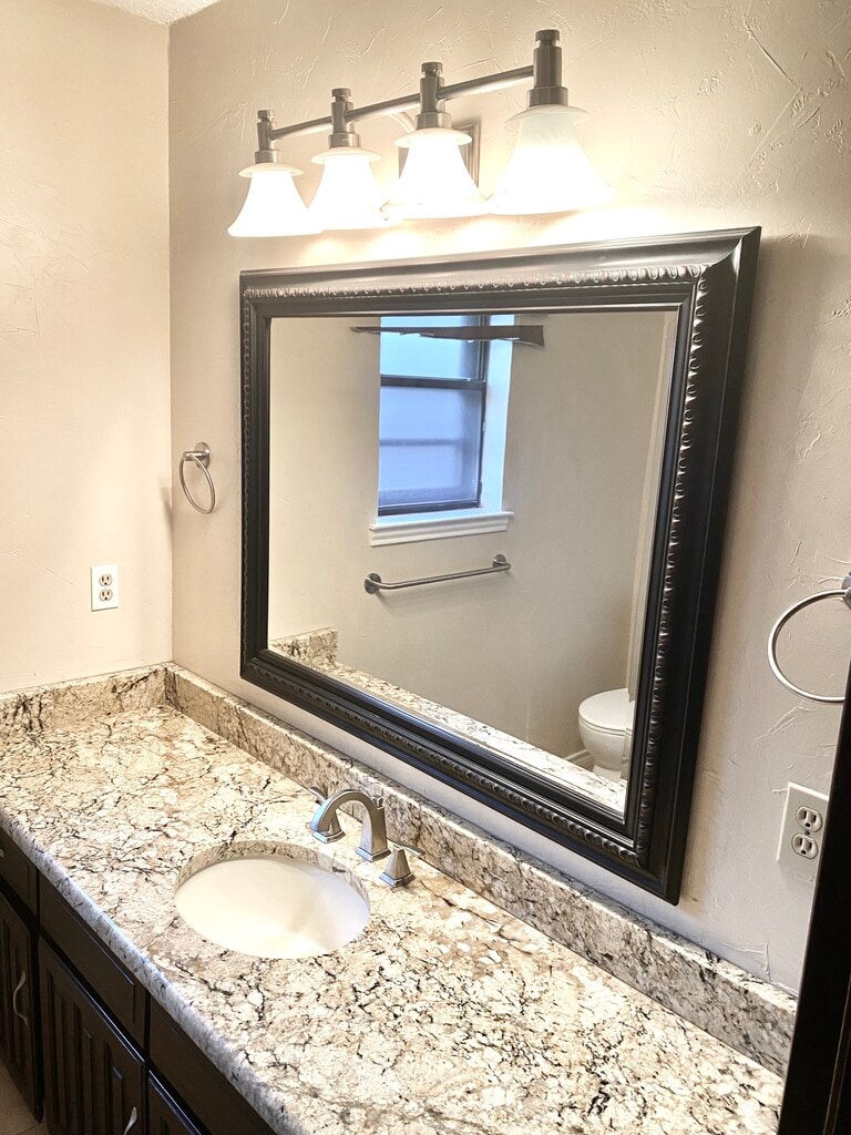 Make this your new home today! Single family home in quiet, established neighborhood on a quarter acre. All rooms are spacious with a split floorplan. New ac unit installed in 2019 and many updated features, including granite counter tops in bathrooms, updated lighting and faucets. Hardwood floors in living space, tile in all wet areas and carpeted bedrooms. Oversized 2 car garage with additional fenced, off-street parking. Backyard is large and a covered porch. (sofa pictured in living room is removed)