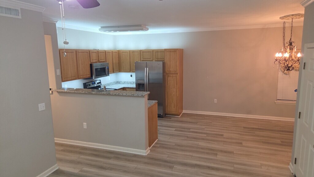 A first floor 2 bedroom, 2 bathroom condo, wheelchair accessible, 1115 sq ft, hard wood floors throughout, fireplace, one car garage and one extra uncovered assigned parking spot. Wifi, water, garbage and HOA dues are included in rent. Pet park, community pool, clubhouse and gym. The wooden frame above the fireplace is made to be a tv bracket.