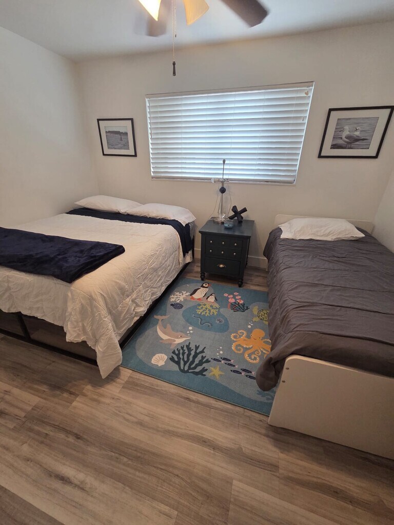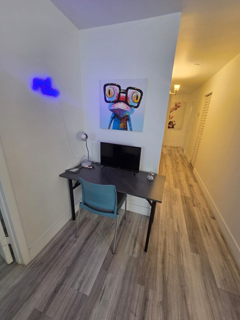Looking for a stylish and comfortable home rental in Miami? Look no further than our beautiful two-bedroom, one-bath home on a duplex. The home is conveniently located near shopping centers, restaurants, and Lejeune Road. The Miami International Airport is close enough for convenience but far enough away from noise or air pollution. The one-story house includes two bedrooms with queen-sized beds, regular closets, and TVs. The bathroom features a tub/shower combo and vanity. The indoor amenities include ceiling fans, and the living room includes a pull-out sofa, a 55-inch TV, two chairs, and a coffee table. The flooring is made of laminate wood, and the open-plan modern kitchen features Italian cabinets and quartz countertops. The dining table can seat 6. The home features two assigned parking spaces in the front, and property tours are available by appointment only. Water and electricity are included for your convenience. Conveniently located, the rental is only 25 minutes away from Hobie Island Beach Park North, 15 minutes away from Jackson Memorial Hospital, and 8 minutes away from Miami International Airport. The South Pointe Park Pier is only 10 miles away. Enjoy nearby restaurants and parks during your stay in our beautiful duplex home in Miami. Contact us now to book your stay.