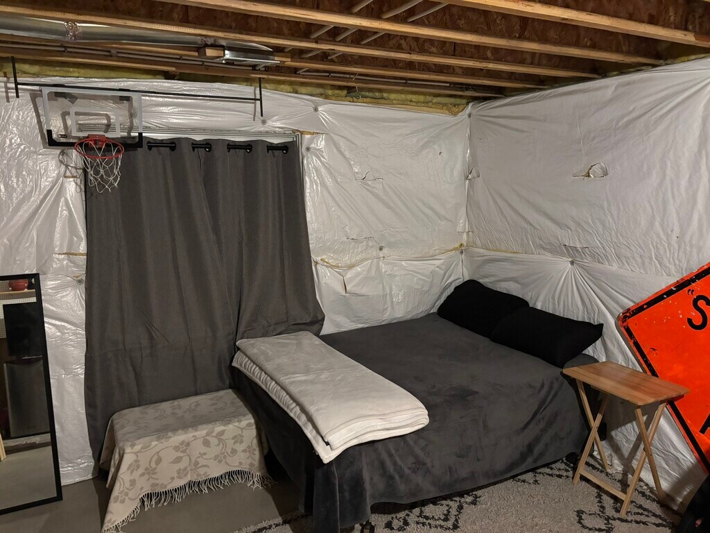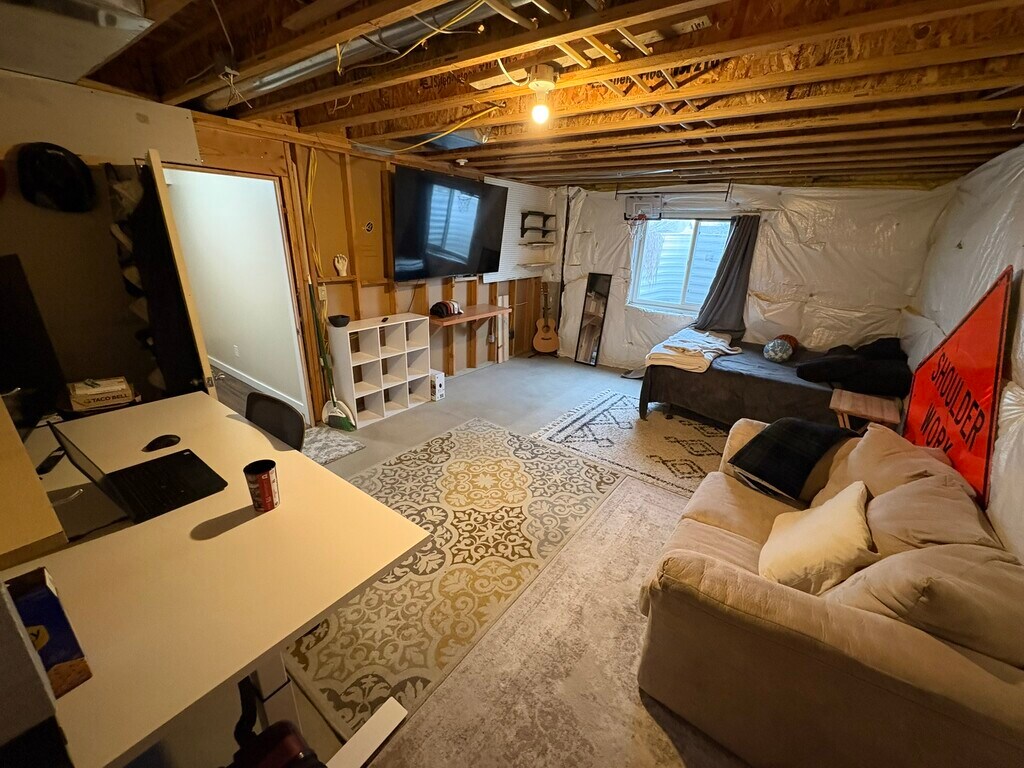 This is the largest room in the house free parking free utilities you share a kitchen with 2 other college aged guys theres 6 guys total in the home all 6 are private rooms. house is maintained incredibly clean. the room has all outlets and lights just no drywall. perfect single guys room. we have had 4 people rent this room over the last 4 years and every time despite no drywall they love the size and freedom of the room
