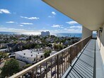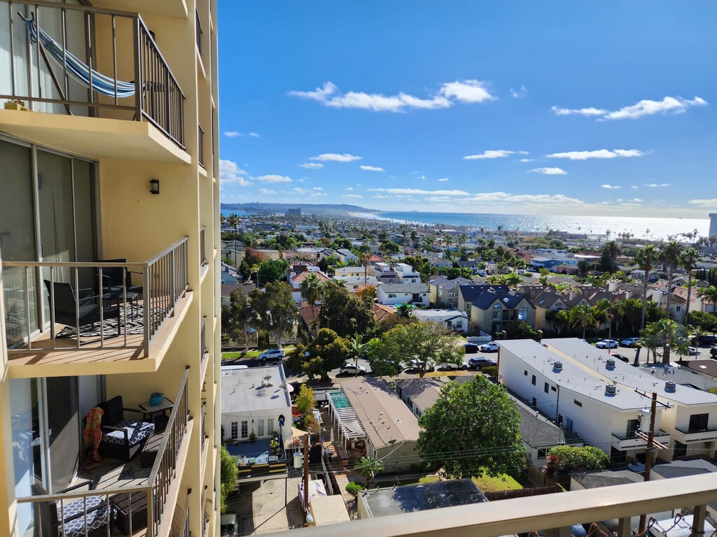 Rare offerings of 9th floor in Pacific Towers in North Pacific Beach. Spacious, light-filled open living area with large windows. Live where others vacation in a secure building for you and your vehicle. 3 blocks to beach. Excellent location with stunning views of city, mountain, bay, ocean. 1,100 sq ft of living space with large balcony. 2 bedrooms 2 baths, wood floors, dishwasher, filtered water and trash chutes. Secure building with underground parking, onsite building manager, elevator, fitness center, pool, rec room and easy walks to restaurants, farmers market shops. and beach. Rent includes water, trash and basic cable. Pets with restrictions