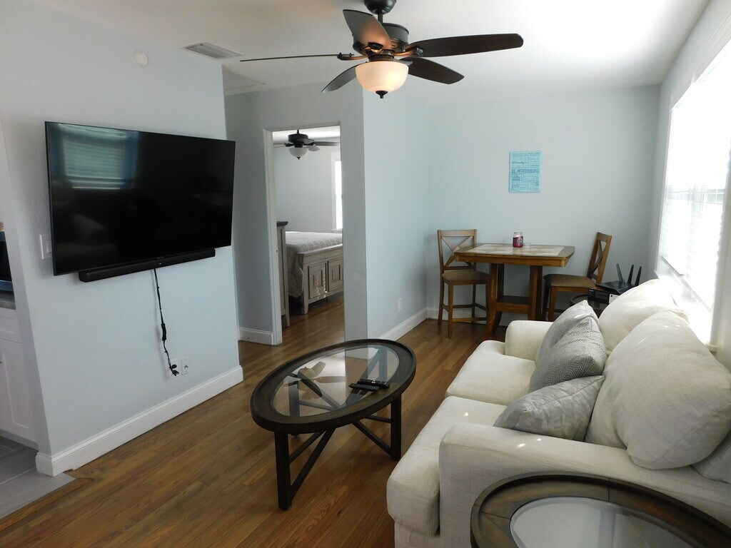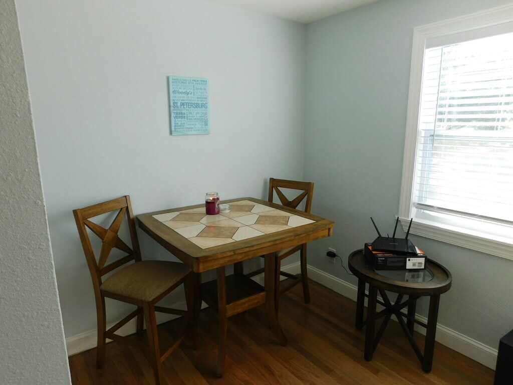Fully furnished and appointed...(water/sewer/trash/wi-fi and cable included)just bring your clothes and toothbrush. The apartment is a detached apartment above a 2 car garage with it's own entrance. This gorgeous apartment was totally remodeled(everything brand new as of 11/21). Impact hurricane windows. Beautiful hardwood floors, knotty pine doors, stunning new kitchen and bathroom....also a large closet with washer and dryer and brand new built in storage shelves and places to hang clothes. Two large tv's(living room and bedroom)includes streaming cable and of course wi-fi. Above ground pool and a shared gazebo make for a beautiful back yard. A smaller storage area is also available. If given notice a larger area may be available in the 2 car garage. 3 car parking pad in front of garage and right next to the gate that leads to the upstairs apartment. Centrally located in the center of St Pete as your less than 10 minutes to the beach or downtown St Pete. The property is managed by a 25 year Real Estate Broker.