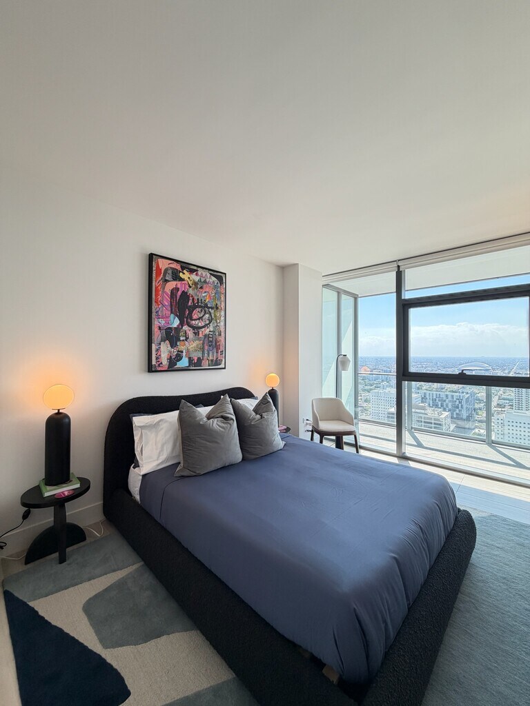 949 sq ft of 1-bed/1-bath living at the center of Miami Worldcenter. Floor-to-ceiling glass, gourmet kitchen with built-in touch control cooktop, high-end finishes, spa-style bathroom, in-unit washer/dryer. Amenities include heated rooftop pool with private cabanas, golf simulator, zen garden and spa, yoga lawn, relaxation lounge, sports deck, media center and theater room, state-of-the-art fitness center, coworking spaces with conference rooms, and 24-hour concierge.