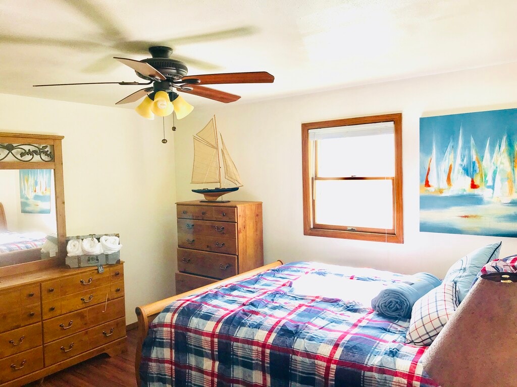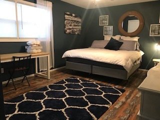This first floor apartment was designed with an industrial, old Appleton vibe. Black and white canvases of Appleton custom created for this property adorn the walls. Custom cut steel trim edges a real wood burning fireplace and edison bulbs in multiple fans and a steel sink overhang complete the look. Old fashioned lift top coffee table is great for couch dining or at home work. We’ve also added a additional workspace to the large master bedroom to accommodate our friends working at home. Walk out mini patio area, two stackable washer-dryers are right outside your apartment door. Full kitchen, large sectional couch, two Roku Smart TVs, dining area, and a very large king bedroom and queen bedroom are highlights of this space. We also love that you have a real wood burning stove and of course a dishwasher!