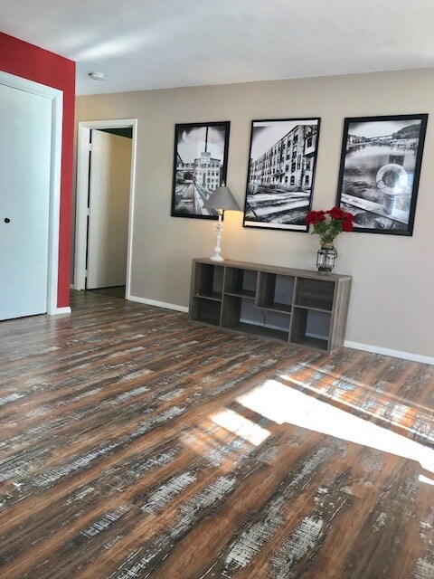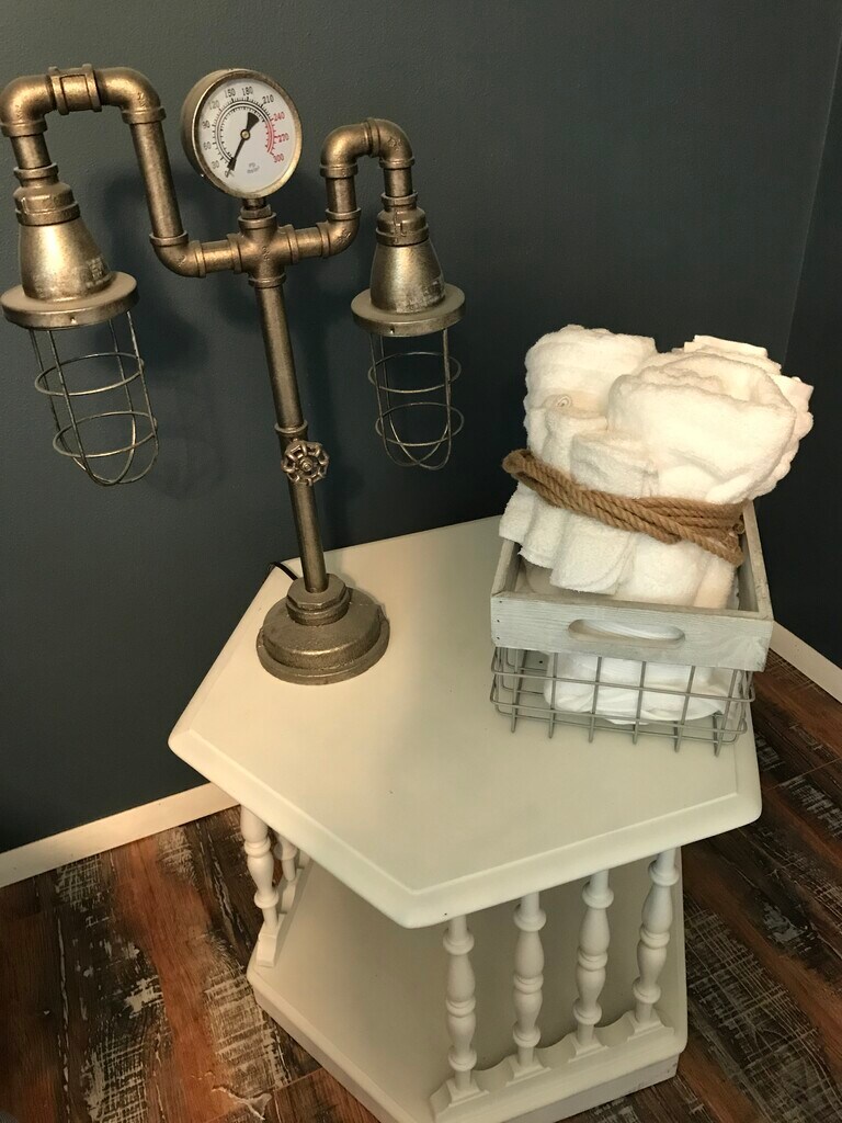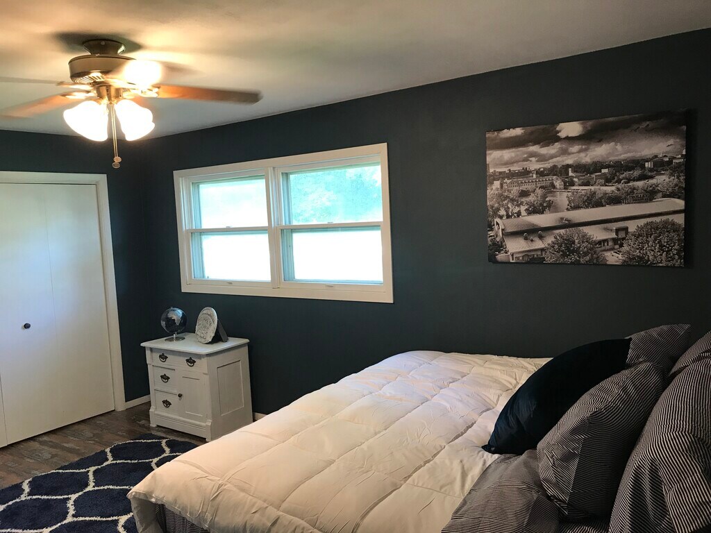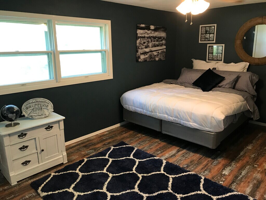 This first floor apartment was designed with an industrial, old Appleton vibe. Black and white canvases of Appleton custom created for this property adorn the walls. Custom cut steel trim edges a real wood burning fireplace and Edison bulbs in multiple fans and a steel sink overhang complete the look. Old fashioned lift top coffee table is great for couch dining or at home work. We’ve also added a additional workspace to the large master bedroom to accommodate our friends working at home. Walk out mini patio area, two stackable washer-dryers are right outside your apartment door. Highlights include full kitchen, large sectional couch, two Roku TVs, dining area, abundant king bedroom & queen bedroom. We also love that you have a real wood burning stove and of course a dishwasher! Appleton Corporate Housing