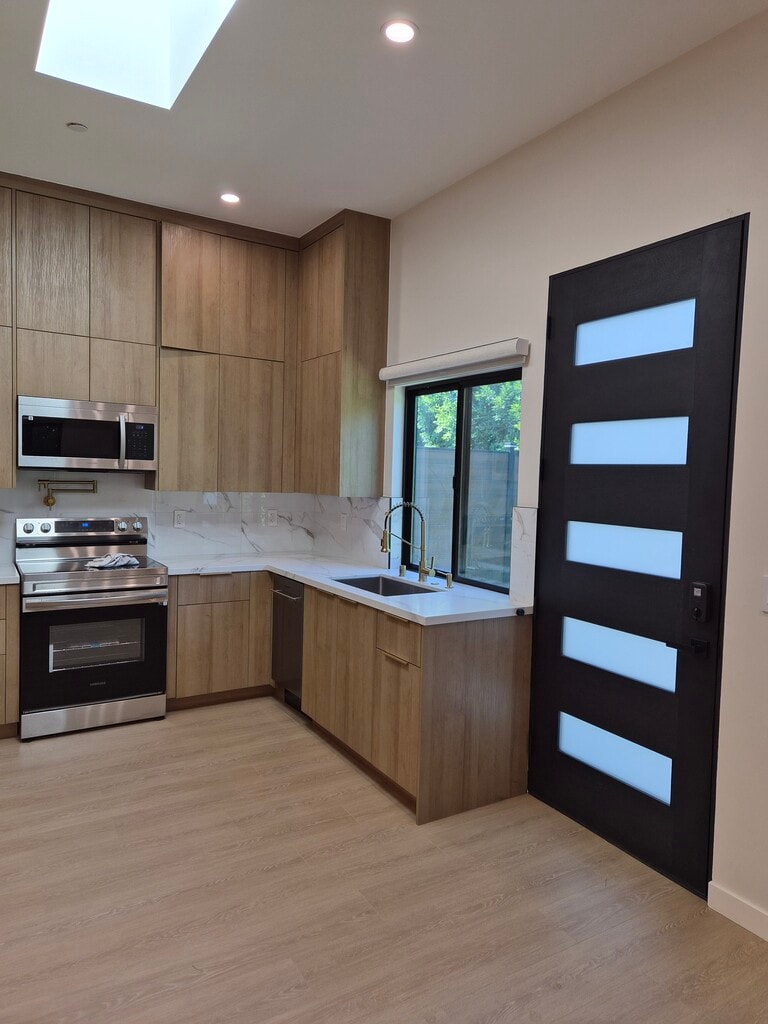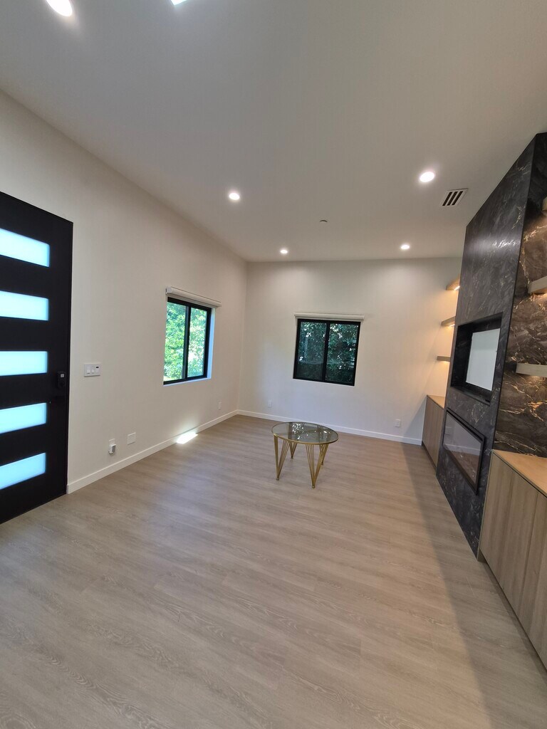 Newly built 2 bedrooms 2 bathrooms with modern finishes in the heart of Encino, in Amestoy Estates. The home is located in a quiet, safe neighborhood surrounded by well-kept single-family houses. This home has a big front yard with turf keeping it low maintenance. The ficus trees provides both beauty and privacy. It already has outdoors Ring cameras and a smart lock installed. The house is equipped with solar panels keeping a low cost electrical bill. Inside, you'll find 10-foot ceilings, a TV wall with a stunning stone, an electric fireplace, and shelves with LED lights. The skylight ceiling in the living room brings in really nice natural light. A brand new kitchen, with unused appliances and lots of storage. Laundry room with a dual washer dryer machine. The master bedroom has an on suite bathroom with dual vanity and a walk-in closet. Additionally, this room features remote control blinds for the window and sliding door which lead to the outdoor patio.