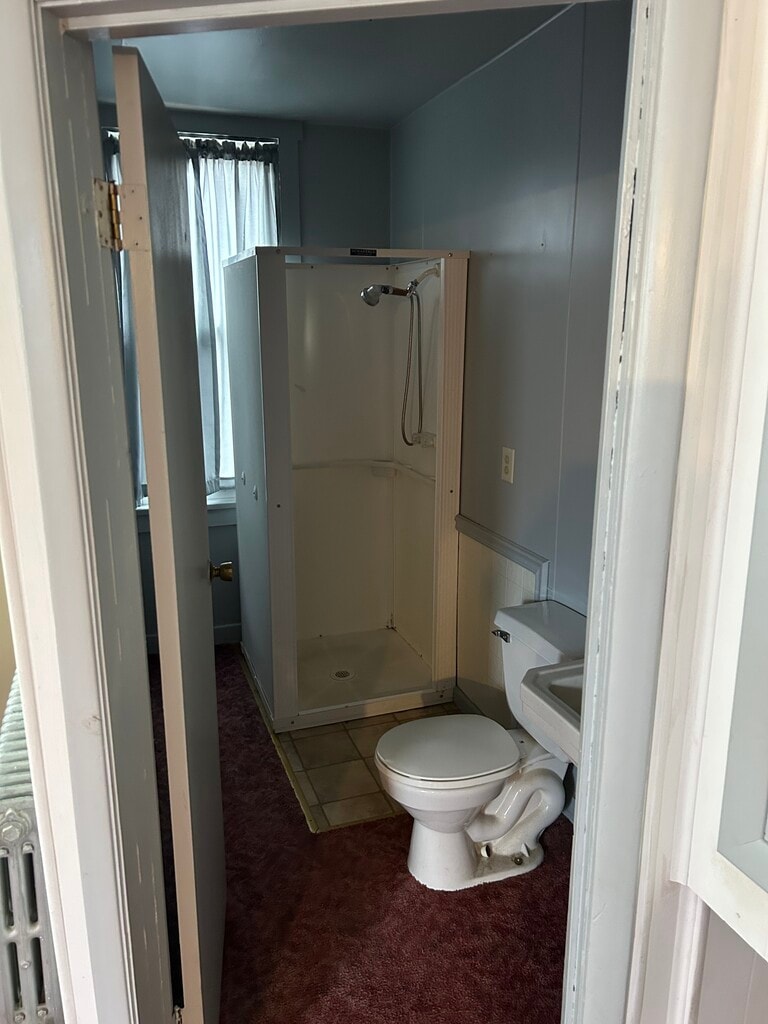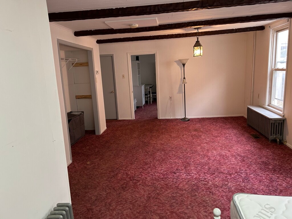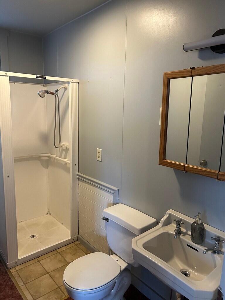 Everything included (all utilities). Unfurnished First floor one bedroom efficiency (1/2 flight of stairs to enter from parking area). This unit is not handicap accessible. Bedroom can be curtained off from an open living room area. Rent is $850 which includes all utilities (includes oil heat, gas hot water, electric, water, sewer, and garbage) One price of $850. Shared laundry with upstairs unit, newer front loading washer/dryer in basement. Separate eat in full kitchen with recent gas range and refrigerator. Plenty of cabinet and counter space. This unit has a shower only, no tub. Private fenced in patio with concrete pad. Plenty of off street parking. This building has a commercial tenant and requires a strict no dog policy. One small, well behaved cat will be considered. Application is required with proof of income.