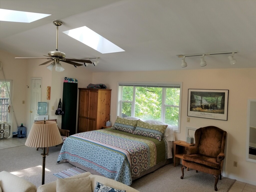 This is as close as you can live to world famous Chittenango Falls! Same height as Niagara! Beautiful scenic 6+ acre property with amazing views in every direction. Very quiet and private. Indoor heated parking. Your own separate building with Luxury Loft, COMPLETELY FURNISHED. Once you see this place in person you will not want to leave... ;)Apartment, FULLY FURNISHED with ALL UTILITIES! 540 sq. ft., on private 6+ acre country estate (with ALL utilities, Internet, etc.) Monthly fee is based on 12 months-- shorter terms negotiable. (AVAILABLE IMMEDIATELY.) 540 square foot studio apartment in separate building on large quiet multi-acre private estate in the country. Vaulted ceilings, big functional skylights, dimmable track lights, lots of picture windows, paddle fan, wall-to-wall carpets, private entrance. Full private bath. Desk and chair. Storage area. Nice full-size kitchen (not "kitchenette"). Balcony, accessed via sliding door. Free heated parking garage is right underneath! Come right upstairs to your studio apartment after you park your car. Furnishings: Almost-new King bed with firm mattress and matching night stands, matching sofa and love seat, arm chair, coffee table, dresser, kitchen table + 2 chairs, big flat screen HDTV + wooden coffee/TV table, water cooler, full size fridge, 4-burner range/stove, big stainless sink with sprayer, microwave, toaster oven, coffee maker, utensils, pots/pans, dishes, etc. No sharing walls, ceilings, or floors with anyone-- this is your own building. Includes all utilities (heat, water, electricity, Internet, snow removal, lawn care, trash pickup). Also includes free high-speed broadband DSL wireless Internet, PLUS wired (CAT-6 Ethernet cable) Internet, indoor heated parking for 1 car, central air conditioning. Use of big back yard, patio with gas grill, washer and dryer. Quiet location. Lawn mowing, snow plowing, trash pickup, indoor parking for 1 car. Views in every direction, next to State park with huge waterfalls (same height as Niagara)-- right in your front yard, with hiking trails and park benches! Application fee waived. Move in immediately for full year lease (shorter term may also be negotiable).
