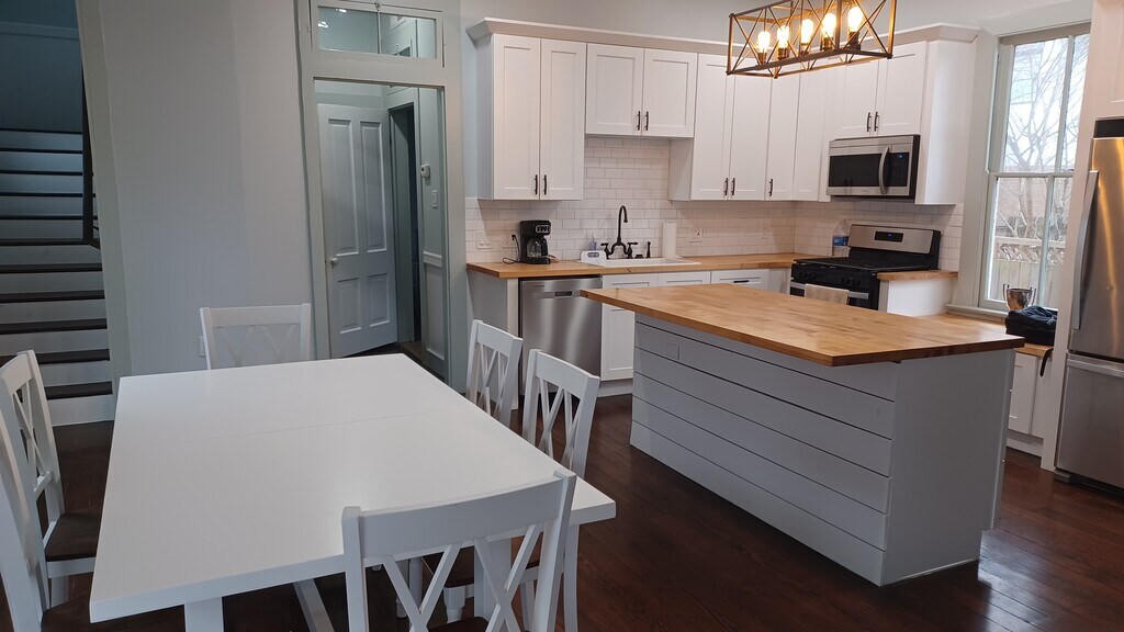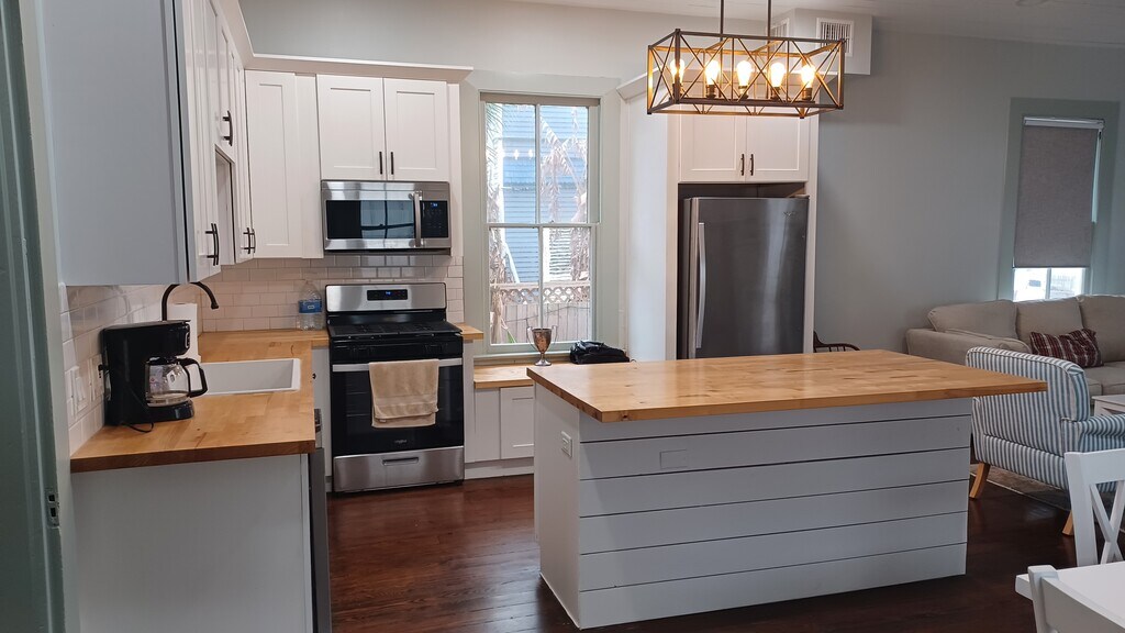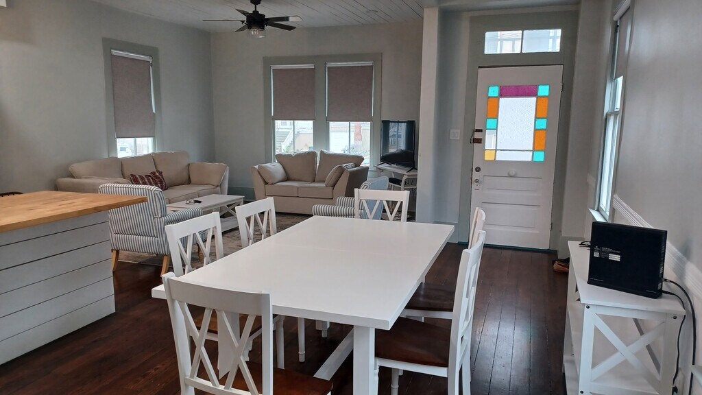 Furnished. New in 2025. Home was fully renovated in 2022: AC, kitchen, all 3 bathrooms, roof, paint, W/D and refrigerator in 2025. There's a gravel parking space to the left of the house behind the porch. I usually park out front.on the street. That is my white SUV. Only one night in my last 6 months here has that street space been taken, Mardi Gras. This is a beautiful East End property, Extremely bright and private. Unusual East End 1st floor.open layout. Large windows, the sun streams in. I have purchased 3 easy to clean beige rugs for the dining room and kitchen. There is not much grass, Just up front. You can cut it in 15 minutes with a stringer. That's what I do High Speed internet xfinity is included. cable. There's a first floor bedroom and full bath. To the right of the house is a patio or use as golf cart carport. It's a 4 block walk to the restaurants on the Strand. I live here now and will share everything when you come to see it. There will be no surprises. I'm moving to be closer to my family in Houston. . Half of 1st month rent.
