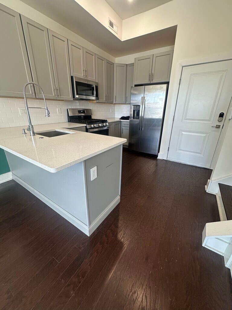 516 W. Montgomery Ave, Unit 3 | Philadelphia, PA 19122 2 Bed | 2 Bath | 1,218 Sq Ft | $2,200/Month ABOUT THIS LISTING Welcome to Unit 3 at 516 W. Montgomery Ave — a stunning, modern multi-level condo built in 2021 in Philadelphia's vibrant South Kensington neighborhood. At 1,218 square feet, this bright and spacious unit delivers contemporary design, quality finishes, and a coveted private rooftop deck with sweeping Philadelphia skyline views. Available for move-in after April 1st. THE LIVING SPACE Rich dark hardwood floors flow throughout the open-concept living and dining area. The expansive living room features soaring ceilings, a ceiling fan, recessed lighting, and oversized windows that flood the space with natural light. Bold two-tone teal accent walls give the unit a distinctive, modern personality. THE KITCHEN The chef's kitchen is a true highlight — featuring gray shaker-style cabinetry extending to the ceiling, quartz countertops, a large island with seating, white subway tile backsplash, and a full suite of stainless steel appliances including a gas range, over-the-range microwave, and French door refrigerator with ice maker. THE BEDROOMS Both bedrooms are generously sized with hardwood flooring, ceiling fans, and ample closet space. The primary bedroom features a dramatic dark accent wall, oversized picture windows with city views, and room for a king-sized bed and full furniture suite. The second bedroom is bright and versatile, featuring a charming green accent wall with custom tree motif — perfect as a guest room, home office, or nursery. THE BATHROOMS Two full bathrooms, both beautifully finished. The primary bath features a sleek black-framed vanity, white basin, and large-format tile flooring. The second bath offers a modern white vanity with stylish blue-patterned shower curtain and large tile floors. BONUS FEATURES Private Rooftop Deck — Exclusive to Unit 3. Panoramic Philadelphia skyline views, perfect for entertaining In-Unit Laundry — Stacked GE washer and dryer included Wet Bar — Upper level wet bar with mini fridge, quartz countertop, and sink Smart Lock Entry — Keypad entry system Central HVAC — Goodman system for year-round comfort Street Parking — Consistently available in the neighborhood at no cost LEASE DETAILS Rent: $2,200/month Security Deposit: $2,200 (one month's rent) Due at Signing: First month's rent + security deposit ($4,400 total) Lease Term: 12 months minimum; longer terms welcome Available: After April 1st Utilities: Sewer and Water Included Renter's Insurance: Required prior to move-in No Pets | No Smoking APPLICATION REQUIREMENTS Application Fee may be required. Background check required (run by ownership) Proof of income required (must provide recent pay stubs, bank statements, or equivalent documentation) Certificate of Rental Suitability available upon request Philadelphia Rental License #: 1002297 ABOUT THE NEIGHBORHOOD South Kensington is one of Philadelphia's most exciting and fast-evolving neighborhoods, offering easy access to public transit, dining, nightlife, and green spaces. Close to Fishtown, Northern Liberties, and Center City.