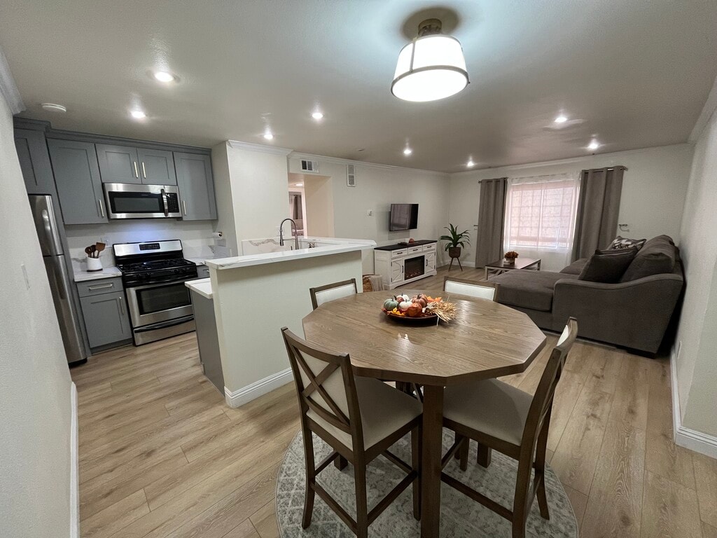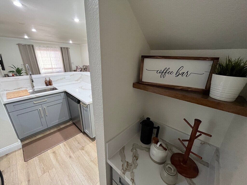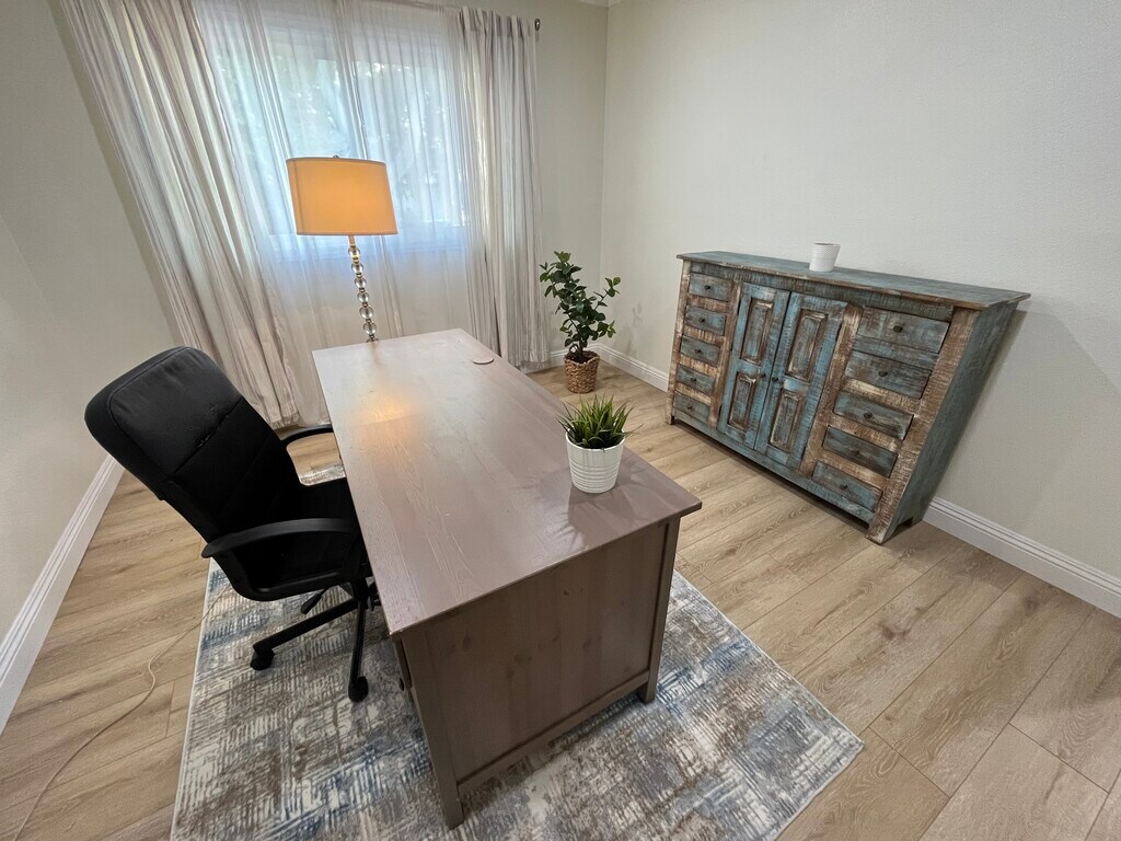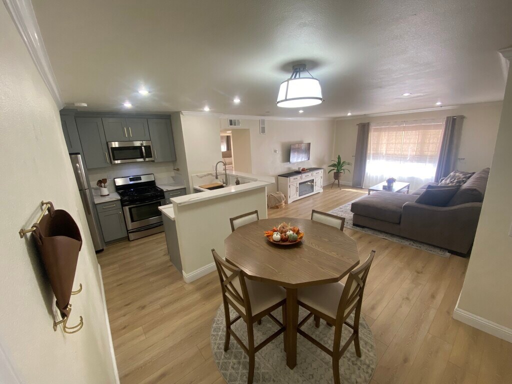 Located in the Noho Arts District of North Hollywood which puts you close to many restaurants, movie theaters, attractions, Universal Studios and Hollywood are in your back yard. This 2-bedroom Condo was recently renovated and fully furnished with a brand new kitchen, featuring a stove, microwave, refrigerator, dishwasher and a coffee bar station. The dining room brings a table with chairs for dinner or house guests. Brand new vinyl flooring brightens the space with freshly painted walls, trim and doors. The living room has a 42 inch tv, a large size couch with a carpet and a coffee table. The master bedroom has large floor to ceiling mirrors, ceiling fan and a new queen size bed with extra seating. The 2nd bedroom is converted into an office space for the work from home community with a large size desk and chair. The bathroom has been remodeled with a dual vanity, classic subway tile, stand up tub and a warm clean aesthetic. The condo also includes 2 dedicated parking spots, FREE on-site laundry, security cameras and key-code gates/doors. Includes water, trash, and internet.