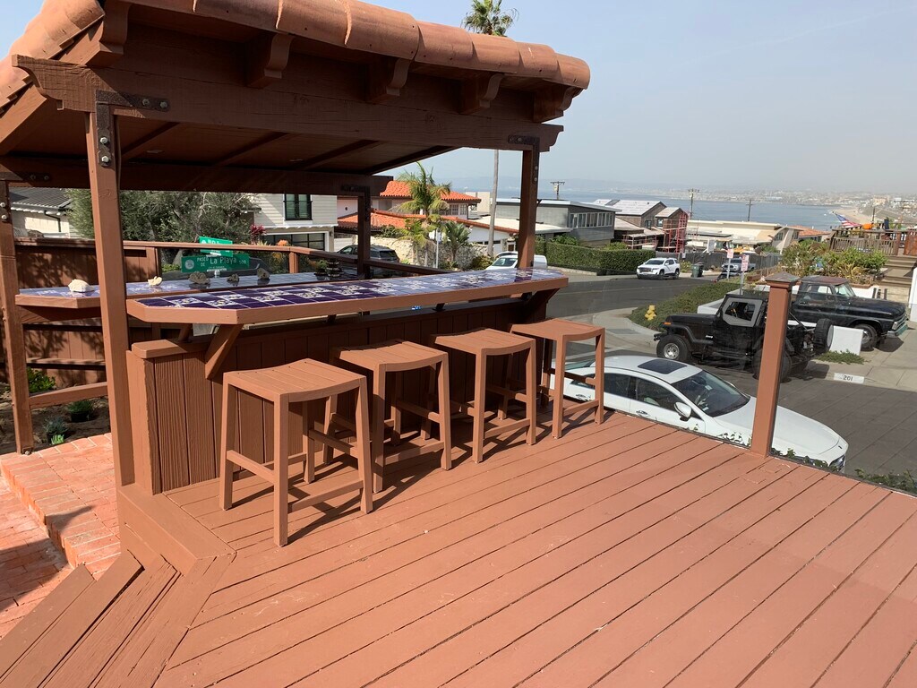 Enjoy amazing ocean views and a 5 minute walk to the beach at this lovely, furnished 3-bedroom, 3-bath home. Available May 1. 3-month minimum lease, discount for longer term. Gaze at the ocean from the front yard deck or bar. View the sweep of the entire South Bay from the picture windows in the upstairs family room or wrap-around balcony. The common areas have gorgeous Brazilian cherry floors. Beautiful hand-painted Mexican tiles and sinks decorate the bathrooms. After a day at the beach, relax in the Jacuzzi-tub in the upstairs bathroom. The house is a short walk down the hill to Torrance Beach and the bike bath. A 5-minute drive or 20 minute walk will take you to Riviera Village and its bounty of restaurants and shops, or to Malaga Cove in Palos Verdes. Torrance Beach has a lifeguard, or take a short walk a down the beach towards Palos Verdes for a quieter stretch and to explore tidepools. The Redondo Pier with restaurants, bike and boat rentals is 2 miles away along the bike path. The kitchen is fully equipped and looks out to the dining area. The open dining and living room has high ceilings, skylights and French doors to the back yard. The ground floor has a master bedroom with ocean views and a TV, two medium-size bedrooms, and two bathrooms, one off the master bedroom with a shower, the other near the back bedroom with a tub and shower. The large upstairs family room has a sitting area with ocean views, wet bar, another set of seating for watching TV, and a desk where you can work looking at the ocean. The upstairs bathroom has a Jacuzzi tub and a separate shower. Two of the bedrooms have queen-size beds and the third is now set up as an office, or can be furnished with twins, which can be combined into a queen. In addition, the upstairs family room has a double-sized futon. The cul-de-sac on the corner is perfect for riding tricycles. Parking is easy in the garage, driveway, or on the street. Use your streaming account, or we can provide full cable TV for $280/month. $400 cleaning fee.