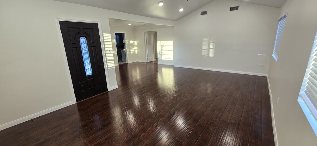 Single family home for rent on a quiet street. Front House of 2 unit property. 4 large, bright and very clean bedrooms and 2.5 bathrooms. 2 Car Garage. Granite kitchen counter tops with tile flooring Wood laminate throughout the house. Master bedroom has a skylight, and sliding doors that open to backyard. Living area approximately 2000 SqFt. Energy saver Central Air/Heat, Insulated walls/windows. LED lighting throughout the house. Has dishwasher and stove, has a laundry room with all the connections, but no laundry nor refrigerator provided.