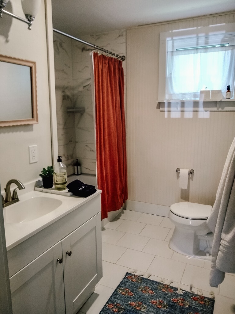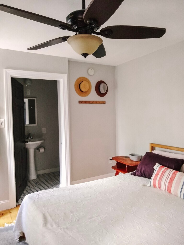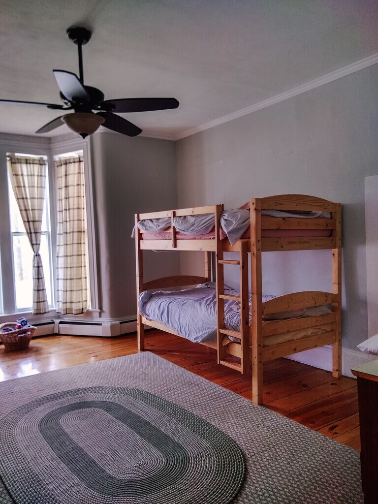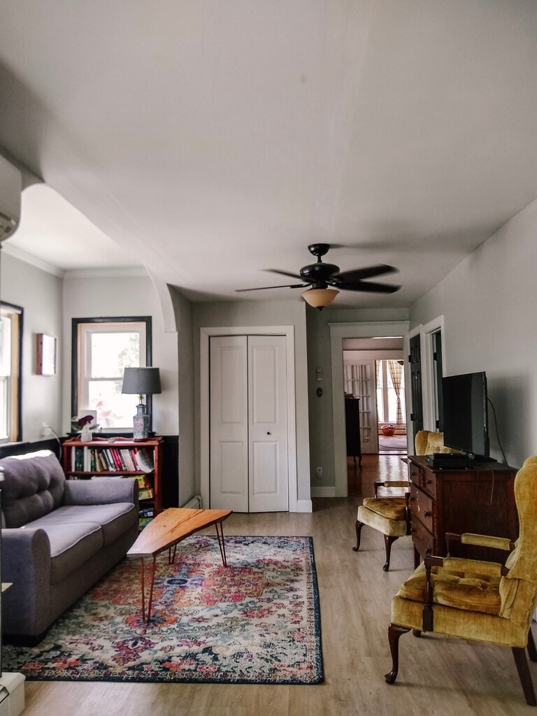 Sunny first floor apartment with beautiful hardwood floors, updated kitchen, and two newly renovated bathrooms. There are stairs from the back entrance so this is not an apartment for those looking for no stairs. -Both bathrooms have tubs with showers. -Master bedroom has attached bathroom. -Second bedroom is quite large with a bathroom just outside the door. -Kitchen has dishwasher, microwave, electric stove, and a large amount of counter space. -Dining area -Back deck and small back yard is just off the kitchen. -Screened in farmers porch on the front of the house. -The back entrance is off the driveway (there are stairs here) leads into a tiled mudroom with washer, dryer, sink, and cabinets. -Mini-split air conditioning throughout unit. -Trash pickup and yard maintenance provided. -Includes two off-street parking spots. -Tenant is pays for electric* and water. **This unit has solar and typically does not have an electric bill May-December** -$1000 deposit and first month rent Showings by appointment