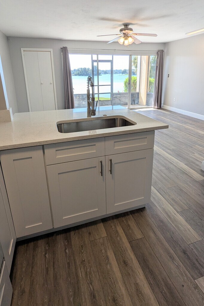 This 1-bedroom, 1-bathroom condo at 578 Orange Dr offers a fantastic view of Lake Orienta. Sit on the porch and enjoy the sunsets! The condo features vinyl plank flooring throughout, brand new kitchen cabinets and quartz counters, and an updated bathroom. The property includes amenities such as a smoke-free environment, a fitness center, a pool, and on-site laundry facilities for convenience. The exterior features well-maintained landscaping and designated parking areas.