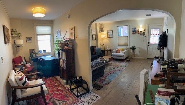This historic 1860s house was one of the originals built in Burlington while it was a bustling port exporting lumbar almost two centuries ago. It is right in the heart of downtown, with a view of Lake Champlain from the porch, one block from the lake/bikepath and a short 7 min walk to Church St and the same to the heart of Pine Street's restaurants, breweries and art galleries. The apartment (half of the duplex) has been updated with a beautiful kitchen with bar, hickory cupboards, gas stove and hidden, stackable washer/dryer. There is a characteristically narrow/steep staircase leading upstairs to a landing, from which the large front bedroom and the smaller guest bedroom/study/office both extend. There is a walk-in closet also from the landing. Escape into the fenced backyard ringed with gardens for an incredible oasis right in the middle of the city! You can lounge in the yard on a lawnchair and escape the city, or swing on the front porch swing and watch the world go by, collecting compliments on your beautiful gardens. The bathroom is located downstairs, and has a tiled bathtub/shower. This is truly a special home, that you will feel right at home in. A new outdoor camera (on all sides) and inside door/window sensor security system adds to piece of mind. Welcome home to a truly special and rare downtown Burlington oasis!