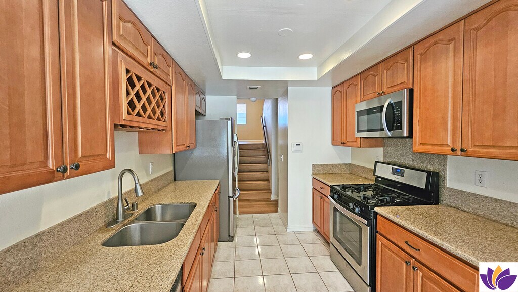 Spacious multi-level townhouse in a desirable gated community of Woodland Hills. The entry level features an open-concept living area with a cozy fireplace, dining area, breakfast bar, and a well-appointed kitchen. Sliding glass doors from the living room lead to a private patio perfect for relaxing or entertaining. A few steps up, the second level offers a versatile den (ideal as a family room or home office), a bedroom, a guest closet, and a full bath. The top level boasts a private master suite with vaulted ceilings, a second fireplace, generous closet space, and an en-suite bath. The attached garage provides ample storage cabinets and a laundry area for added convenience. Community amenities include a sparkling swimming pool and tennis court. Conveniently located near Warner Center, shopping, dining, and freeway access.