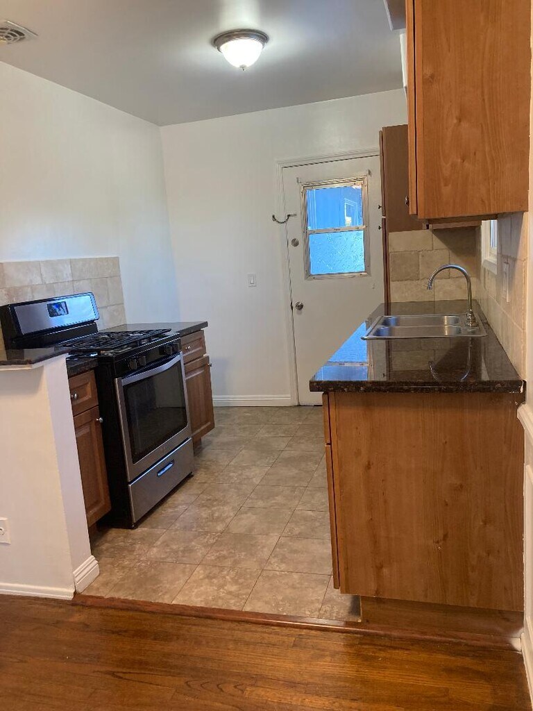 Large 2 Bedroom/ 1 Bath Upper unit Located in Well Maintained Quiet Building. Freshly Painted. Light & Bright. Updated Kitchen with Granite Counters and Stainless Steel Stove. Large Bathroom with Tub. Hardwood Floors In Large Living Room and Dining Area. 2 Large Bedrooms with Carpeted Floors. Large Closets. Front and Rear Entrances. Laundry on Premises.