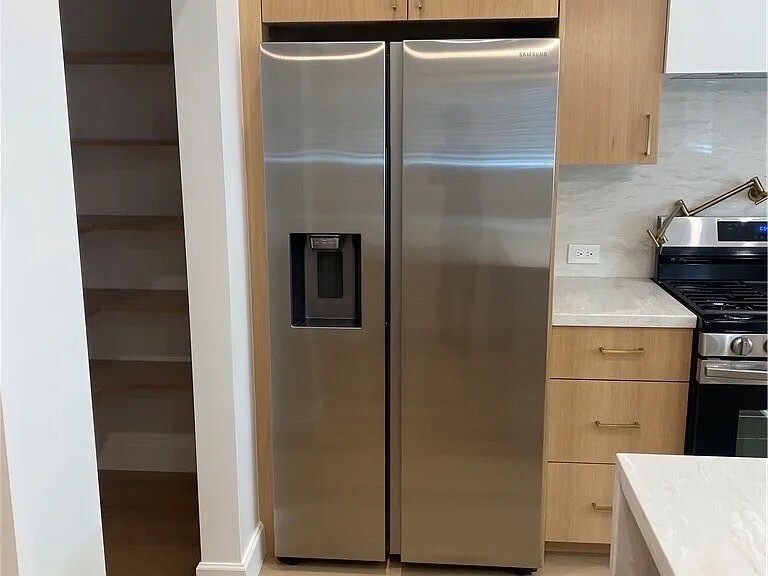 This beautifully completely remodeled 3BR 2BR house offers luxury and style. Featuring 10 feet ceilings, with hardwood floors, and elegant gold accents this space is designed for modern living. The open concept kitchen boasts custom cabinetry, quartz countertops, and high end Samsung appliances ideal for cooking. The home also features sleek finishes ,96 inch doors, and modern HVAC vents throughout. Outside, enjoy a private, low maintenance yard with artificial turf, California gold gravel, and block walls.