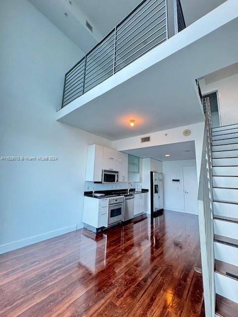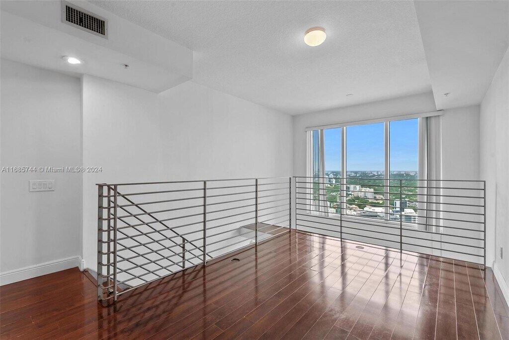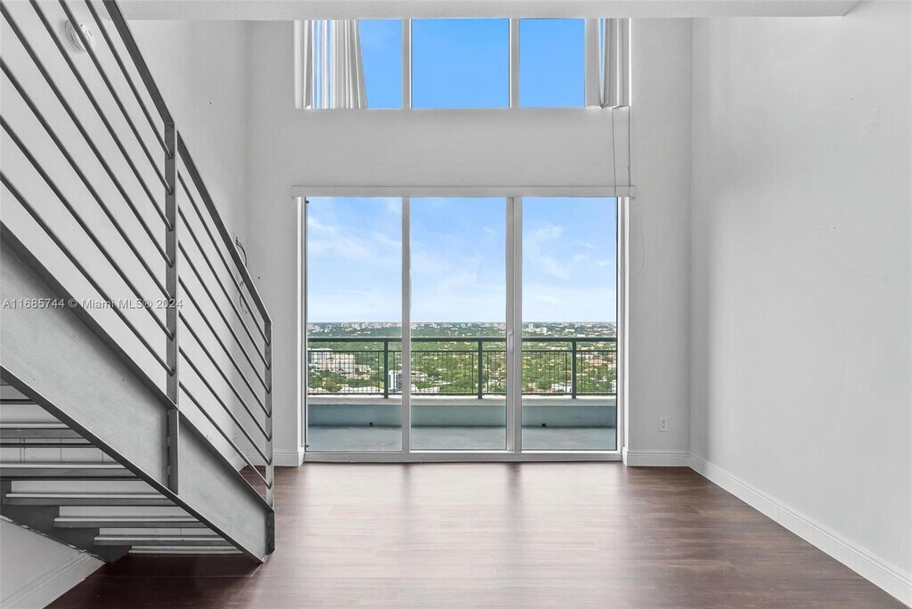 This stylish apartment features an open, modern kitchen equipped with stainless steel appliances and is illuminated by impressive double-height windows and a spacious open balcony offering panoramic city views. The first floor includes a convenient half-bathroom and a welcoming living space, while the second floor is dedicated to a luxurious master bedroom with a walk-in closet and a full bathroom. With in-unit washer and dryer and access to premium amenities like a pool, gym, sauna, meeting room, 24-hour security, and valet parking