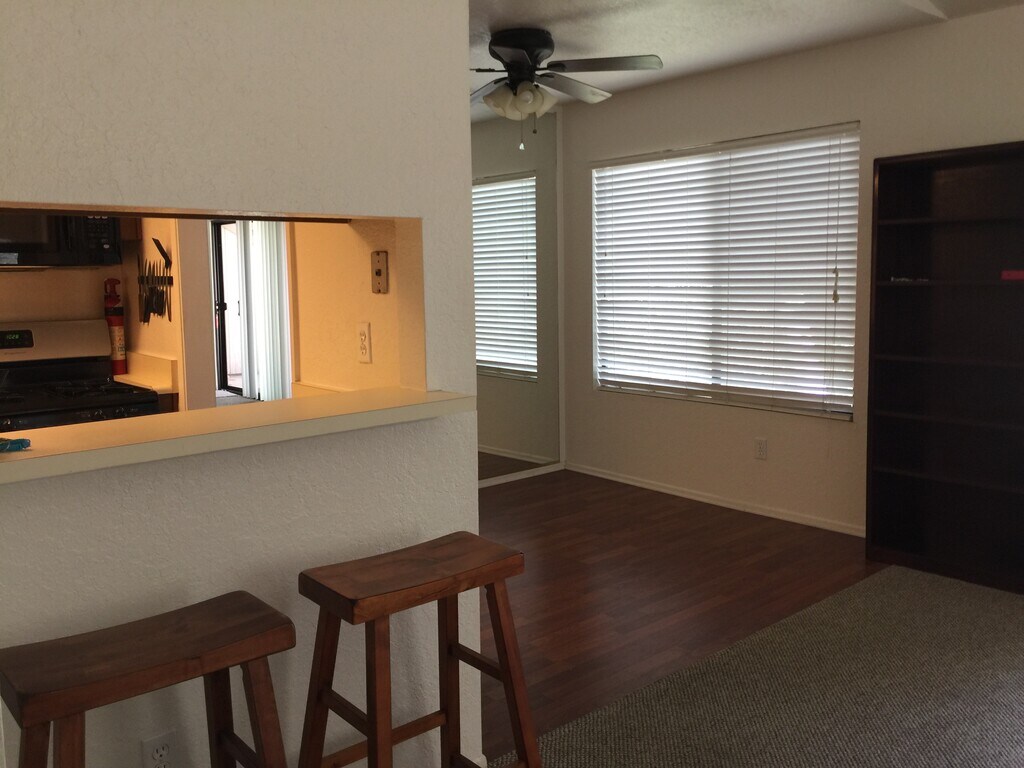 This unit is super quiet end unit, second floor unit over looking tree lined canyon view. Excellent north western light disposition with large widows and high ceiling in living room. Skylight in bright bathroom with shower and large counter sink. As owner we only own units that we would be willing to reside, and this condo is truly a gem. Drive onto the property located at Canyon Creek HOA, one side of the complex are managed apartments, and our side are owned individually condos. Application process directly through owner than a rental company, so we encourage prospective tenants to engage us if you are interested in viewing. Pls send us a text for best time to call back to discuss the condo. The complex is only a short walk to Canyon Crest shopping complex: there is a Ralphs, restaurants, gas, banking, Rite Aid, and more. Also about 1.5 miles to UCR. Easy to even bike to campus. One car garage for storage, but the unit itself is a spacious one bedroom. Original owner mirrored the bedroom, entry and dining room adding more nature light and created an open feeling. A/C. and ceiling fans. Nice balcony overlooking canyon view. Offers privacy and good separation from others. Near by is the Sycamore Canyon hiking area, yet another nice attribute to the complex. Several pools and hot spas located on the property. We are installed new carpet in the bedroom/closet and living room area. the other areas are laminate cheery hardwood or tile. Pls no pets as this is a second floor condo with no secured yard. If you have pets we suggest you explore 1st floor units. HOA covers water and trash, and landscaping. Tenant pays electric, gas, internet. Thanks for looking. Best to send us a text giving us a few options to call back. Steve/ Karen