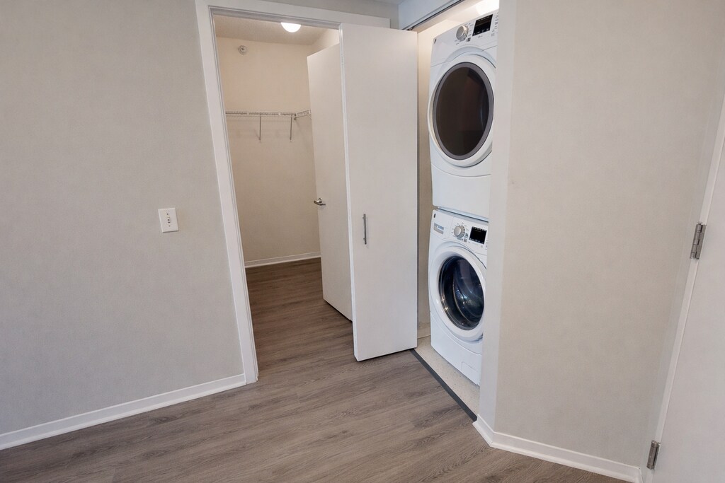 Studio Apartment with Balcony & City Views Bright and well-designed studio apartment featuring hardwood floors, floor-to-ceiling windows, and a private balcony with city skyline views. The open layout offers flexible living and sleeping space with excellent natural light throughout. The modern kitchen includes quartz countertops, stainless steel appliances, white cabinetry, and a functional island ideal for dining or additional prep space. Multiple closets, including a walk-in closet, provide ample storage, and an in-unit washer and dryer adds everyday convenience. The bathroom features a clean, contemporary design with a tub/shower combination, tiled surround, modern vanity, and chrome fixtures. Pet-friendly and thoughtfully finished, this residence offers comfort, functionality, and style in a full-amenity community. Community Amenities Over 50,000 sq. ft. of amenity space Outdoor pool with sundeck Private poolside cabanas Outdoor kitchen and dining areas Outdoor dog park Fully equipped fitness center Outdoor running track Indoor basketball court Party room and resident lounges Indoor parking garage 24-hour door staff Resident events and social programming Apartment Features Large private balconies Floor-to-ceiling windows Quartz countertops Stainless steel appliances In-unit washer and dryer Wood flooring throughout Spacious, open floor plans On-call maintenance Storage units available Bike room available