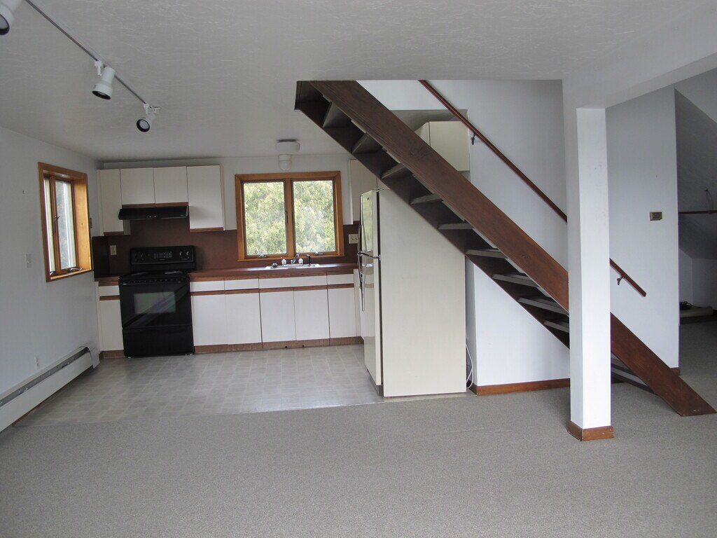 Lakefront loft style 1BR. Open plan 988sf. Full kitchen with DW, heat and water. Full size W/D. Deck with views and beach. Walk to town. No smoking or pets. 2 parking spots, 115v EV charging. Lease @ $1,800. 1.5 months security.