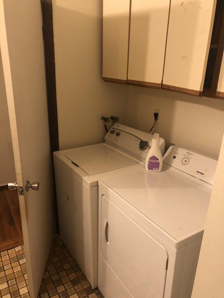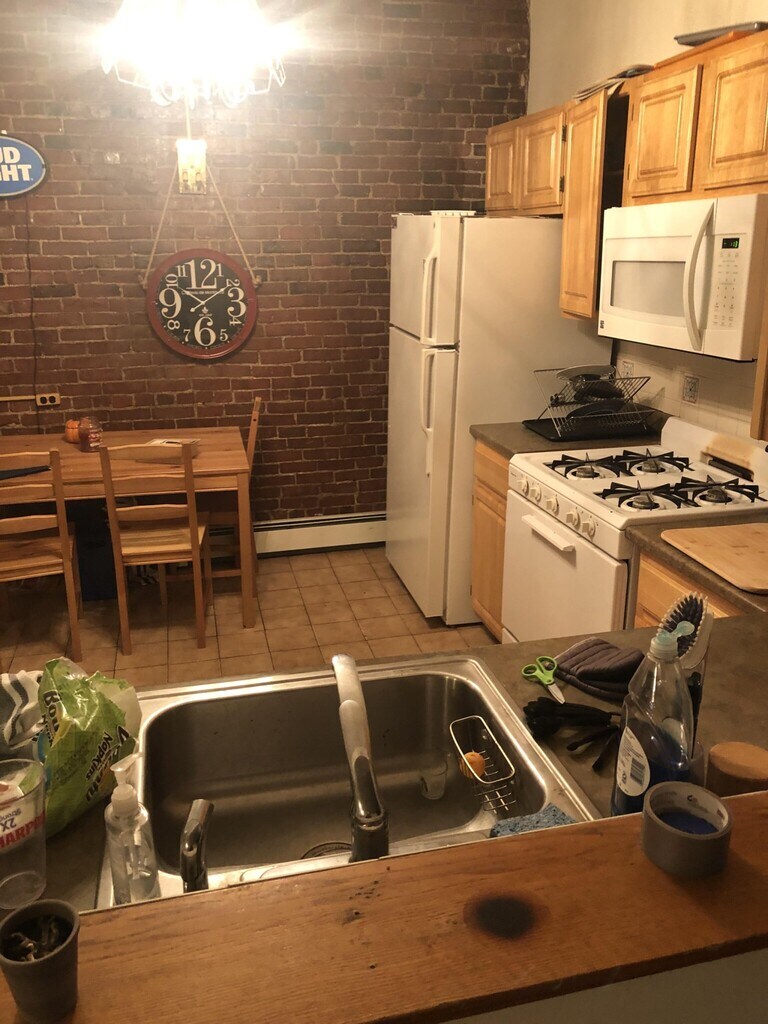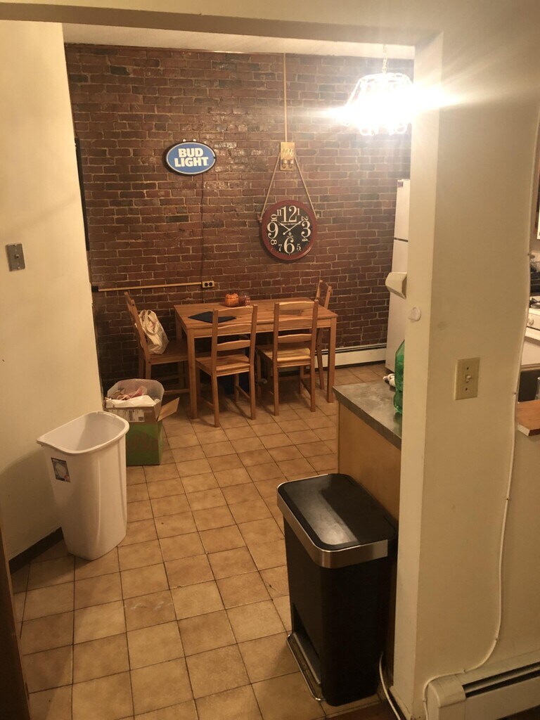 Duplex Brownstone unit seconds to NEU featuring: - Hardwood flooring on 1st level! - Modern kitchen w/ dishwasher! - Small breakfast bar in open layout! - Spacious 1st floor living room! - Lots of sunlight & high ceilings! - Charming exposed brick walls! - 4 generously sized bedrooms! - Ground floor bonus living area! - Ample closet & storage space! - Updated tiled full bathroom! - Laundry machines in building!