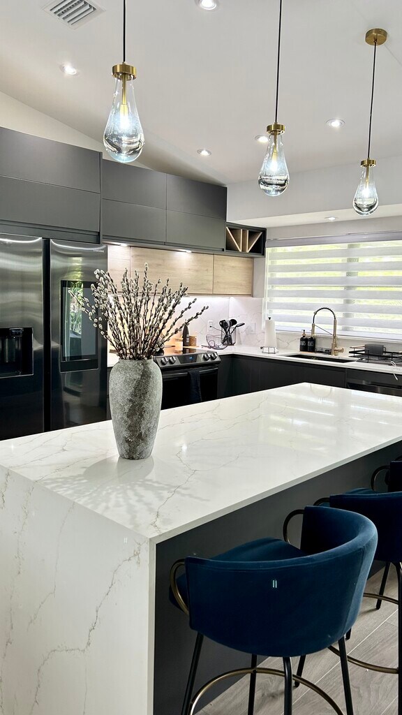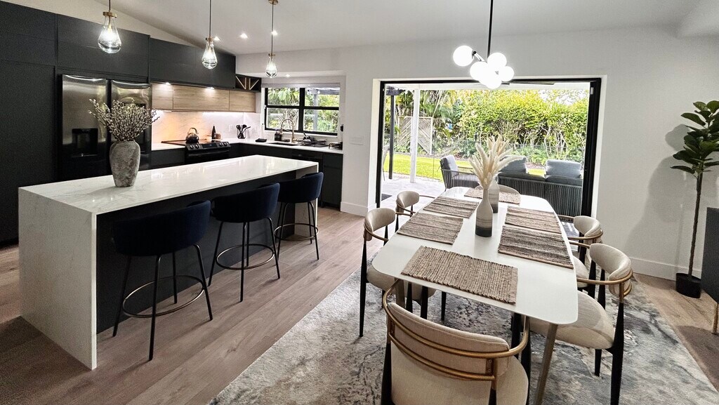 Available NOW! ~Seasonal/Short Term Rental ~ New Full interior and exterior renovated 3/2 house. Escape into your own private paradise! Enjoy the peace and tranquility of this extremely secluded "Private Island" vacation home, surrounded by endless breathtaking lush landscaping. Experience the beauty of the outdoors, and enjoy the fresh air, as you relax with friends and family. This unique home is the perfect getaway from the hustle and bustle of everyday life. This "Private Island" house is conveniently located in Poinciana Gardens, just minutes from Downtown Hobe Sound. You'll truly appreciate the seclusion this home has to offer as it sits alone, without neighbors on either side. Our modern farmhouse home was built on just over a quarter acre lot with boundaries of a vast lake and tract of land; which would be great for an early morning or evening walk. Listen to the pleasant sounds of bird's chirping, while cooking a homemade breakfast outside on the patio, which overlooks endless lush, tropical landscaping. Or would you prefer having bagels and coffee out in the peaceful nature sitting area; nestled just under the bamboo shoots and palms? Which also makes the perfect place to relax or take a nap in the large cozy hammock. For the fisherman, feel free to spend a quiet afternoon fishing at the bass filled lake that's located within footsteps of our home. Inside this beautiful 3/2 house you'll find that each room features 12ft. vaulted ceilings, lighted ceiling fans, window treatments, smart TV's and gorgeous sleek engineered wood floors throughout. Every bedroom and bathroom is decorated simply, yet cozy enough to feel like home. No need to worry this new fully furnished house has plenty of extra bedding, pillows, towels and some basic toiletries. Hobe Sound is referred to as "The Hidden Gem" since the small town is hidden less than 4 miles North of Jupiter Island/Tequesta and just over 10 miles South of Stuart. Travelers desiring to dine out will find many different restaurants in and around Hobe Sound, such as, the locals favorite; Harry and the Native, Taylor's Beach House, or The Grove. For travels looking for a more of a fine dining experience book an evening out at Michael Jordan's restaurant, 1000 North. Which is located just nearby in Jupiter Island. Another upscale restaurant that's a MUST, is Tiger Wood's restaurant, "The Woods". If you'd prefer a relaxing, easy going night, you have the option to stay home and have takeout or possibly even cook a delicious meal in our fully equipped custom kitchen. Here you'll find every thing you need from dishes, pot & pans to the basic seasonings and condiments needed to make a five course meal. Afterwards, you can unwind with your favorite beverage outback and soak in the 4 person steamy jacuzzi. All TV's and appliances throughout the house offers smart/Wi-Fi compatibility. We also have keyless entry, with 24 hr. security monitored property system and 24 hr. night motion sensor lights that you'll find located around the outside property. I look forward to booking your stay!