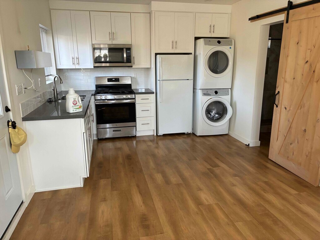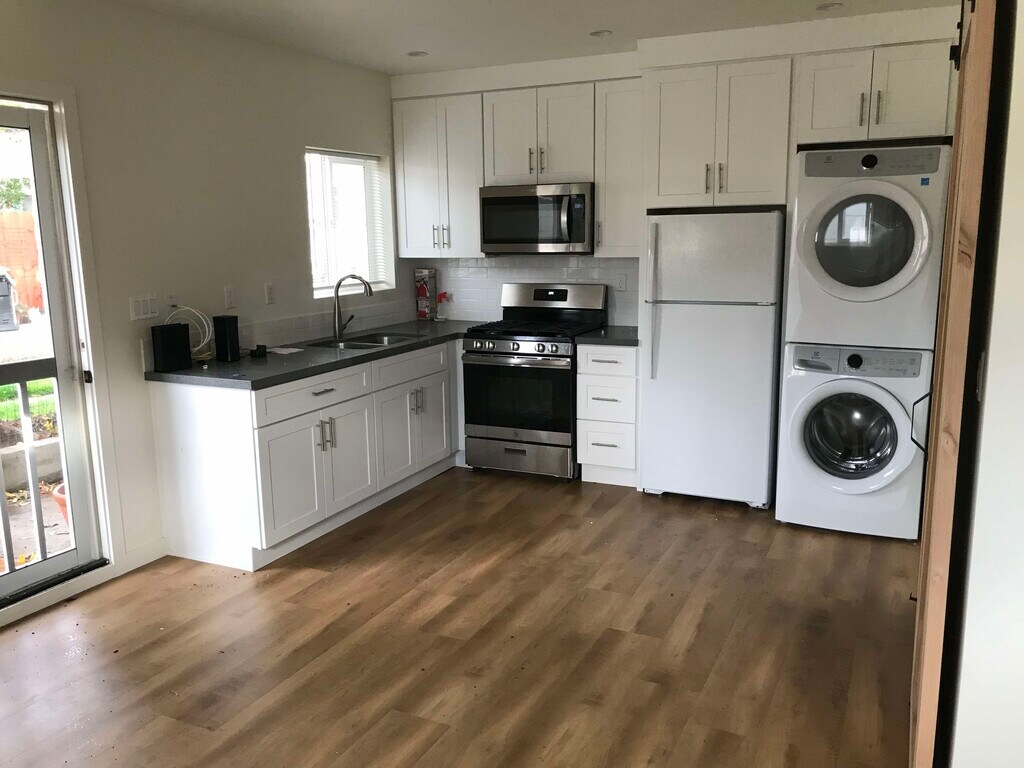 Charming, quiet, secluded newer (2020) ADU / studio / guesthouse in Valley Glen neighborhood of North Hollywood. 1 previous, very clean tenant. The unit is very well-maintained. Full kitchen with full-size washer-dryer. Bright new luxury laminate flooring. Sliding pine barn-door bathroom door. Lots of sun and shade. Small private garden, patio. Mini-split A/C & heat unit in wall. Private driveway entrance and walkway with lush trees & plants. Full-size washer-dryer, refrigerator, oven-stove, microwave included Full bathroom with sliding barn door and fully tiled shower Studio is unfurnished Tenant pays Electricity, Internet-Cable, Gas - Owner pays DWP water, trash, sewage. Gardener service Quiet, family neighborhood - walk to Valley College. - Minutes to NoHo West shopping center with Trader Joe's, Regal Theaters, shops, restaurants, Starbucks. Will consider small, quiet pet with pet deposit Generous outdoor entrance/walkway area with small private garden space and room behind the unit for additional outdoor storage. Easy-going, helpful, hands-on owner.