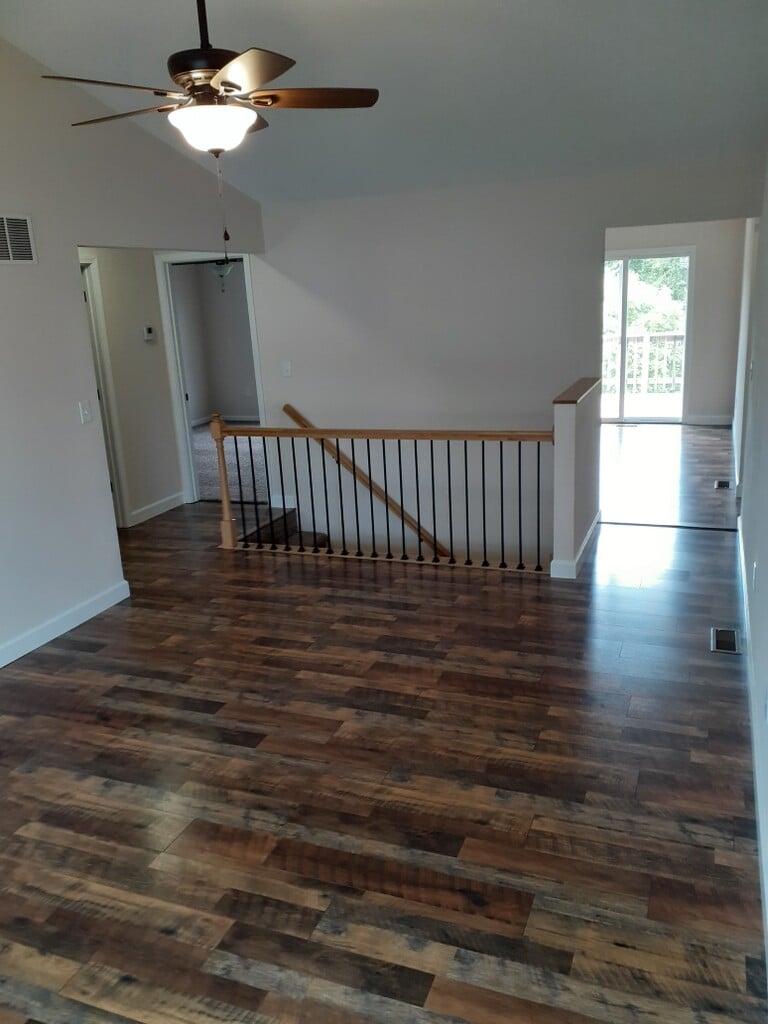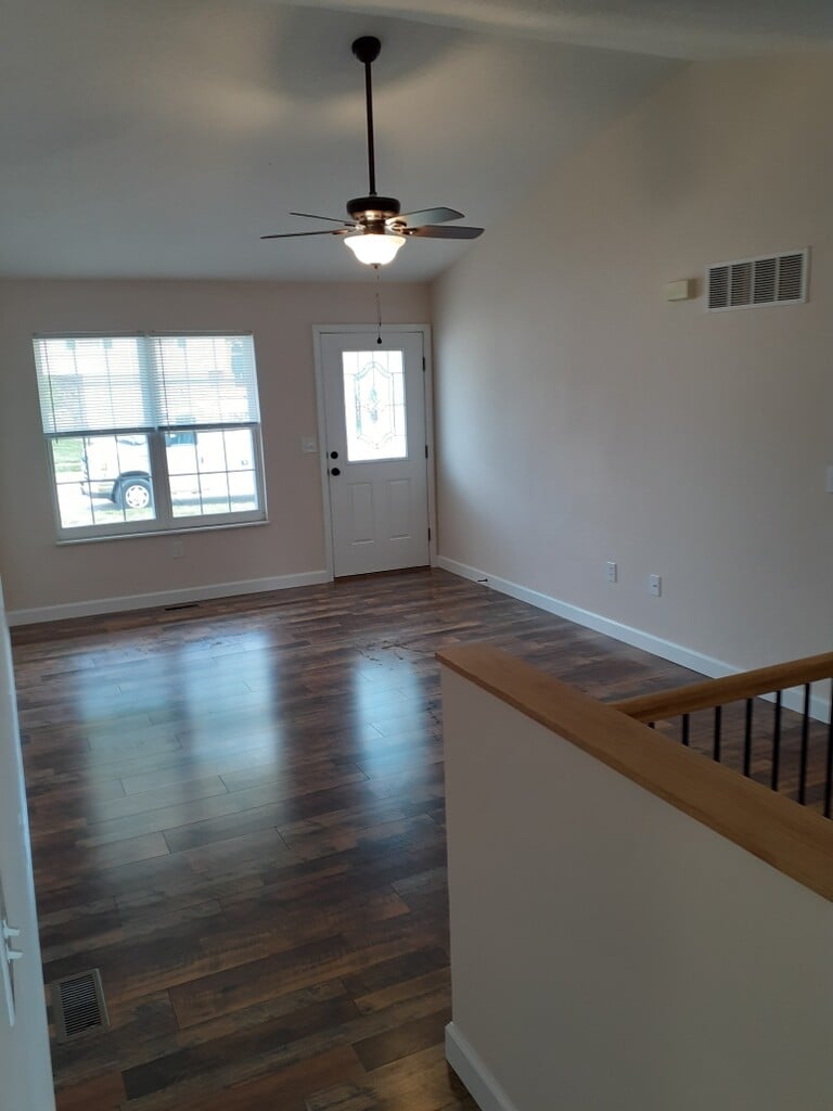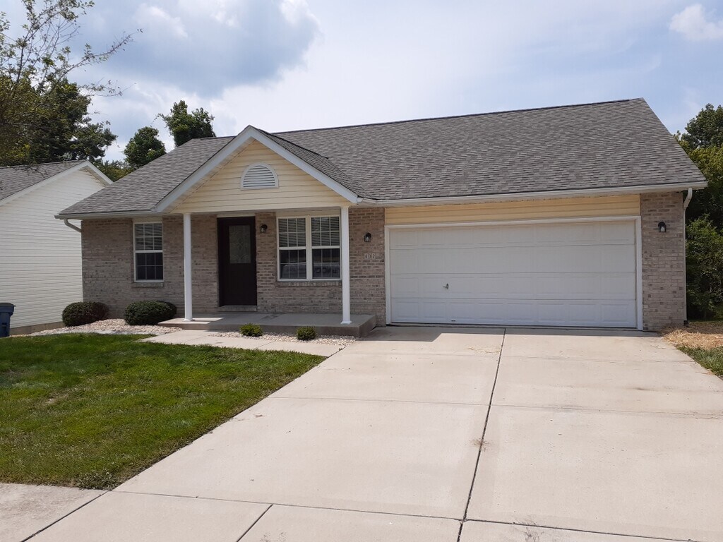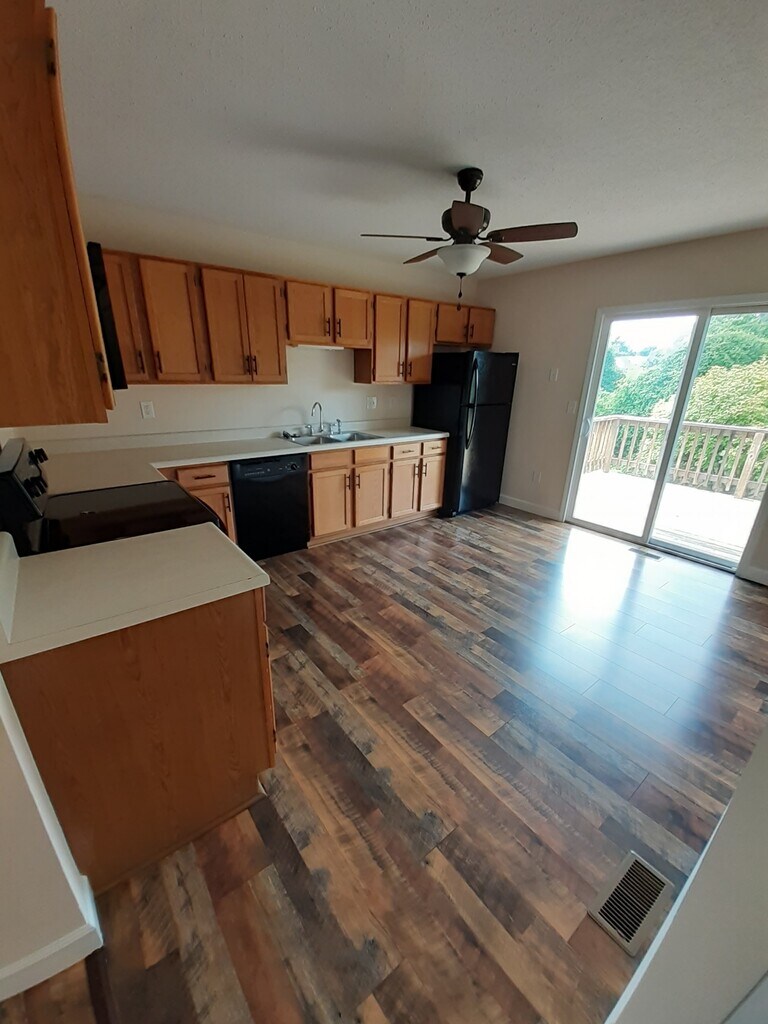 3 bedroom, 2 bath house. Attached 2 car garage with openers. Hard surface flooring in living room, kitchen and halls. All black appliances in kitchen including dishwasher and microwave. Gas & Electric. Deck off kitchen. Carpet in bedrooms. Master bedroom has attached full bath. Ceiling fans throughout. Finished family room in basement with walkout to patio. Main floor has washer & dryer hookups. Lawn maintenance provided. Strict 2 car limit. Pet policy is one pet under 25 pounds. $25 more a month, $300 non refundable pet fee. Application, application fee, credit and background checks required.