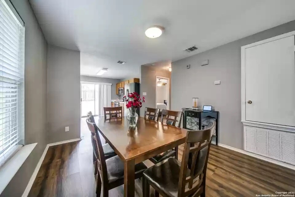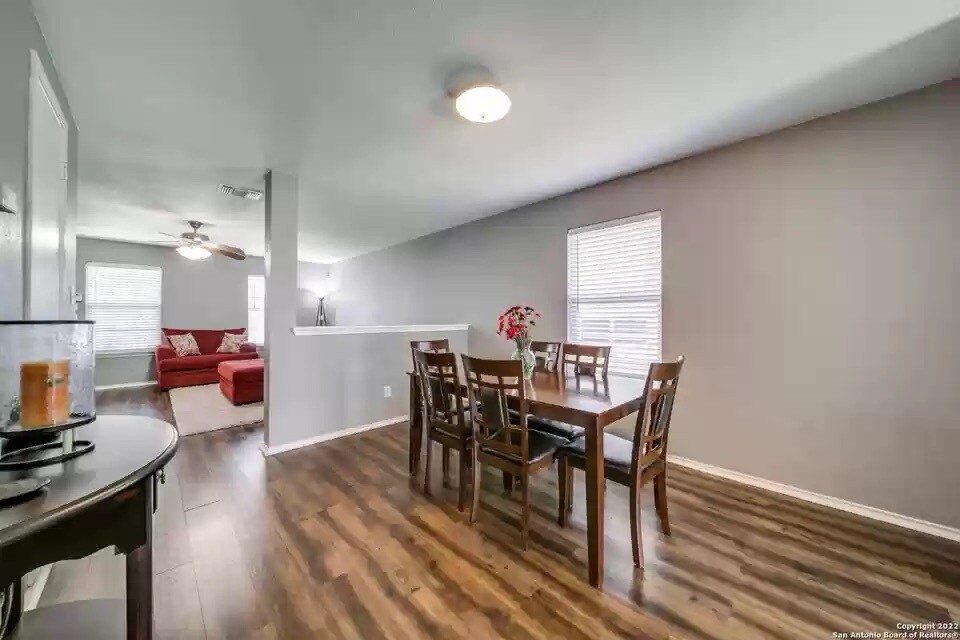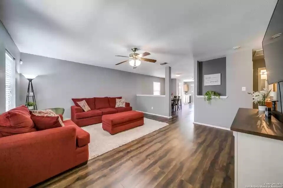 1-story in highly desirable neighborhood, Miller Ranch. Great curb appeal w/fresh landscape & lighting adds to the beauty of this well-maintained 3-2-1 home. Open concept living allows flow for entertaining family and guests alike. Wood laminate flooring throughout w/tile in baths and newer paint. Spacious kitchen gives any chef lots of counter space, cabinets, newer stove/range and micro to cook! Owners suite roomy w/walk-in closet, full bath with single vanity & garden tub/shower. Split secondary's nice size. Great backyard for playing, bar-b-ques, garden or just relaxing. Easy commute to nearby SAMMC, I-10 & I-35, RAFB, employment, shopping and schools.