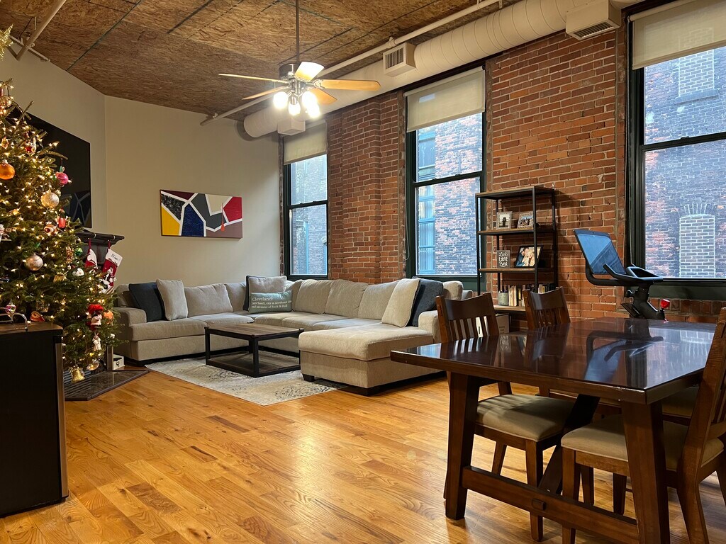 Beautifully updated, open-concept 2 bedroom, 2 full bath condo in the prestigious Cloak Factory Building with RESERVED PARKING SPOT IN ATTACHED GARAGE INCLUDED! Enter into a wide open space and immediately notice the soaring ceilings, gorgeous solid oak hardwood floors throughout, and solid wood beams. The main living area is truly the heart of this home with the signature exposed red brick, ceiling height windows and cozy fireplace. The large kitchen is modern with clean line cabinetry, granite countertops, stainless steel appliances and a large breakfast bar. The oversized bedrooms both have large closets and beautiful brick accent walls. Both bathrooms are generously sized and boast gorgeous marble countertops. Enjoy the downtown rarity of a full utility room with washer, dryer, and sink! The Cloak Factory features 5-star amenities with access to a state-of-the-art workout facility, keyless entry, dog park, sauna room and a 15,000 square foot rooftop terrace overlooking First Energy Stadium! With the Warehouse District being the heart of entertainment in Cleveland, you can enjoy the finest restaurants, sports venues and culture that the city has to offer right on your front door step.
