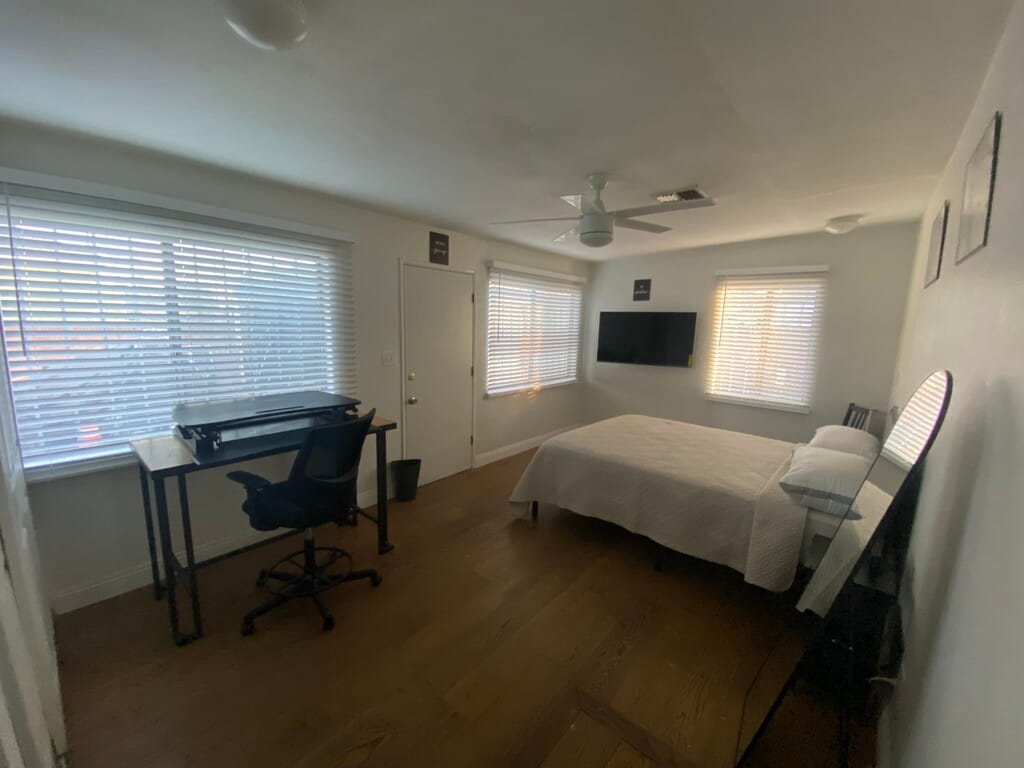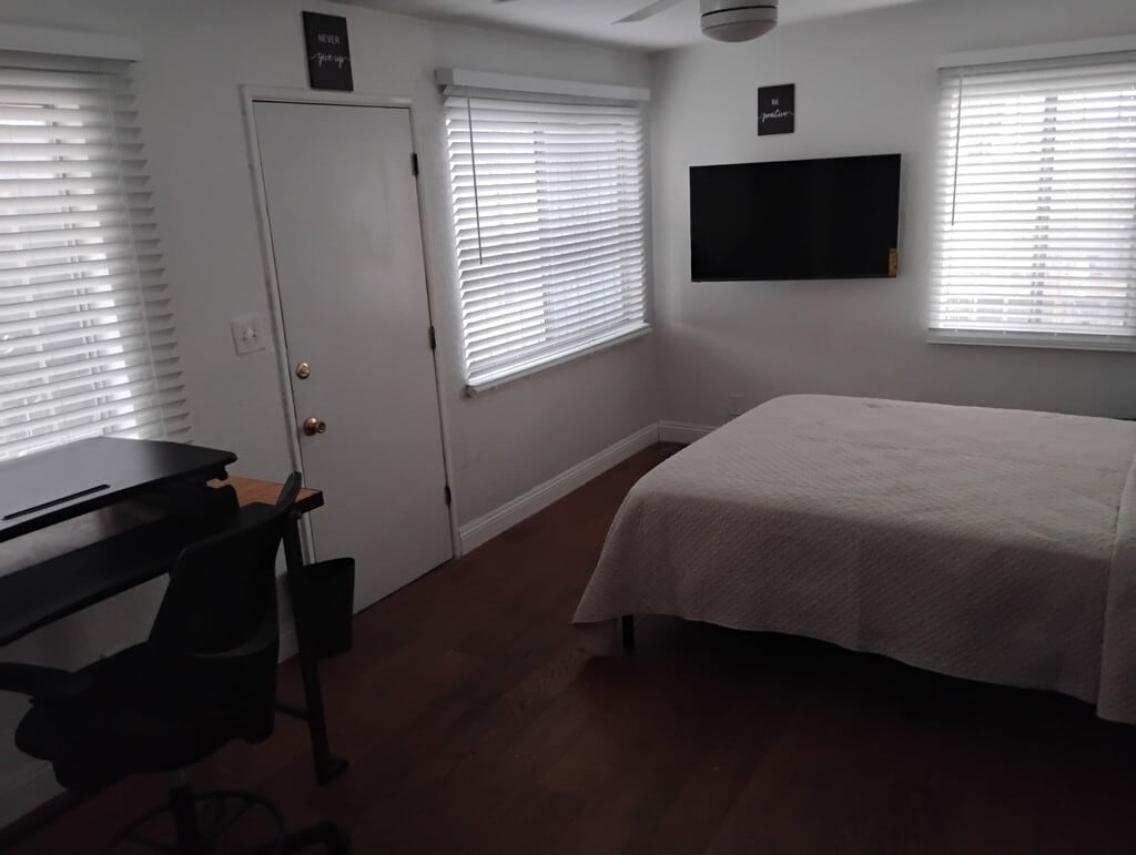 PRIVATE, FURNISHED or UNFURNISHED BEDROOM (UNIT 2) • Smart-Lock Entry • Flat-screen TV • Ceiling Fan • Large Windows • Laptop Desk • Queen bed • Space Heater for addt’l personal warmth • Dirty Clothes Hamper FRONT SHARED BATHROOM • Standard Bathtub/Shower • Dual-flush toilet • New faucet fixture • Stays Clean and Sanitary