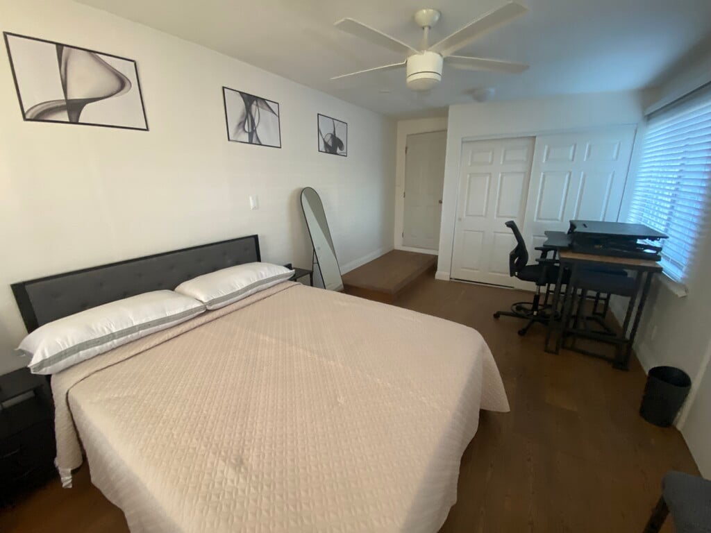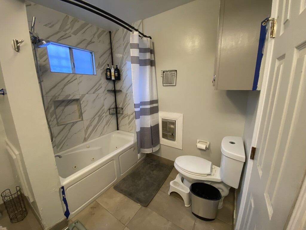 LARGE PRIVATE, FURNISHED or UNFURNISHED BEDROOM (UNIT 4) • Smart-Lock Entry • Flat-screen TV • Ceiling Fan • Large Windows • Laptop Desk • Queen bed • Space Heater for addt’l personal warmth • Dirty Clothes Hamper FRONT SHARED BATHROOM • Jacuzzi Spa Bathtub/Shower • Dual-flush toilet • New faucet fixture • Stays Clean and Sanitary