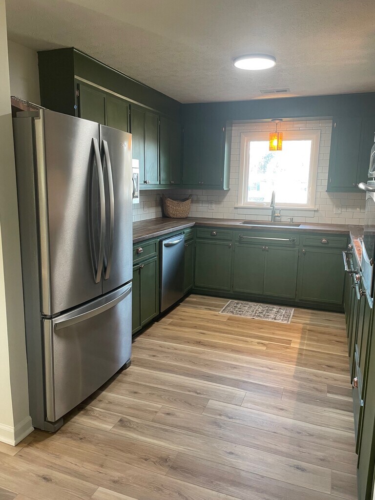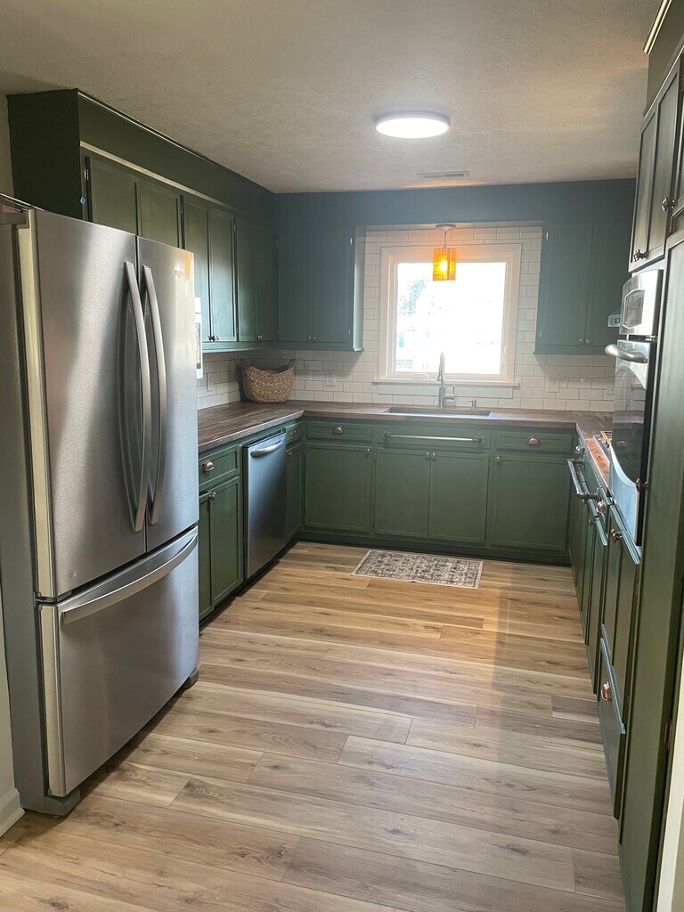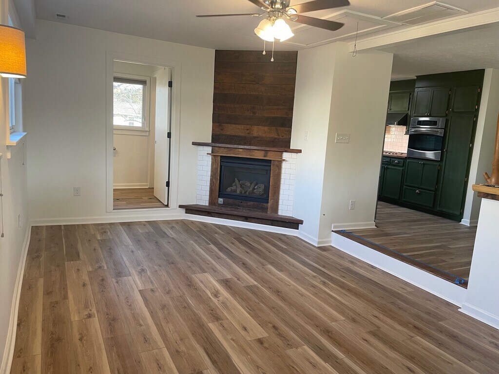 Newly renovated 3BR 1.5 BA ranch home on the greenway. Screened front porch, covered back porch, gas fireplace, fenced yard, spacious shed.
