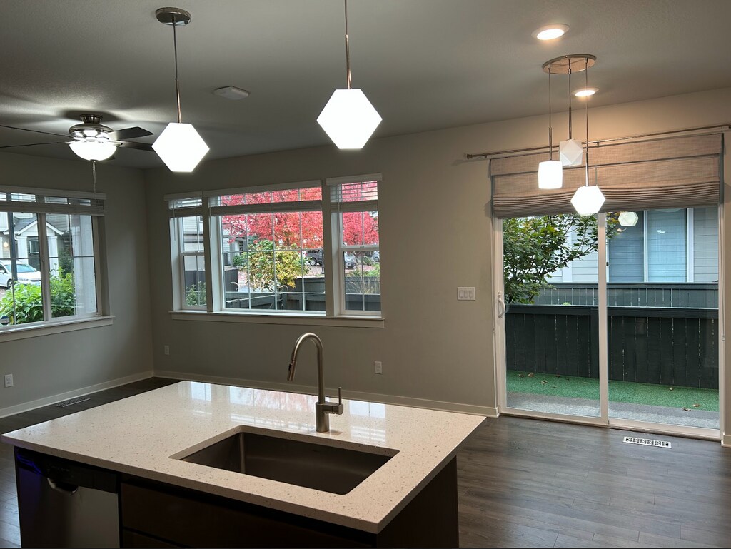 Rare end-unit in the coveted Rosedale Parks community, this 3-bedroom, 3-bath home offers convenience, comfort, and modern design. The main floor features a spacious great room with a sleek fireplace, luxury flooring, and a chef’s kitchen complete with quartz counters, a large sit and serve island, and a high-end GE gas cooktop. Oversized windows and southwest exposure fill the space with light, and the dining area opens to a private fenced side yard—perfect for entertaining, relaxing, or enjoying time with your pets. Upstairs you’ll find a generous primary suite with ensuite bath and walk-in closet, two additional bedrooms, and a flexible family room/loft space. Tech-friendly upgrades include built-in network wiring for faster wifi throughout the house (great for remote workers), a Schlage smart lock, Honeywell thermostat, Ring doorbell/camera, Westinghouse smart TV, and Samsung HE washer/dryer. An oversized two-car garage provides ample storage and workshop space in addition to parking. As a tenant, you’ll enjoy exclusive access to the Rosedale Parks clubhouse, which includes a pool, spa, fitness center, fire pit, and community gathering spaces. Weekly front yard landscaping, walking paths, and seasonal neighborhood events make this a truly welcoming community. Located within walking distance to new schools, shopping, a food truck park, movie theater, bowling alley, and Fred Meyer, this home also offers easy access to the tech corridor, trail systems, and dog parks. Rent is $2,750/month with a one-year lease and $1,500 security deposit. Tenant pays utilities (billed monthly by owner). Up to two dogs allowed with a $300 non-refundable pet deposit; smoking not permitted. Tenants must follow HOA rules. $55 application fee.