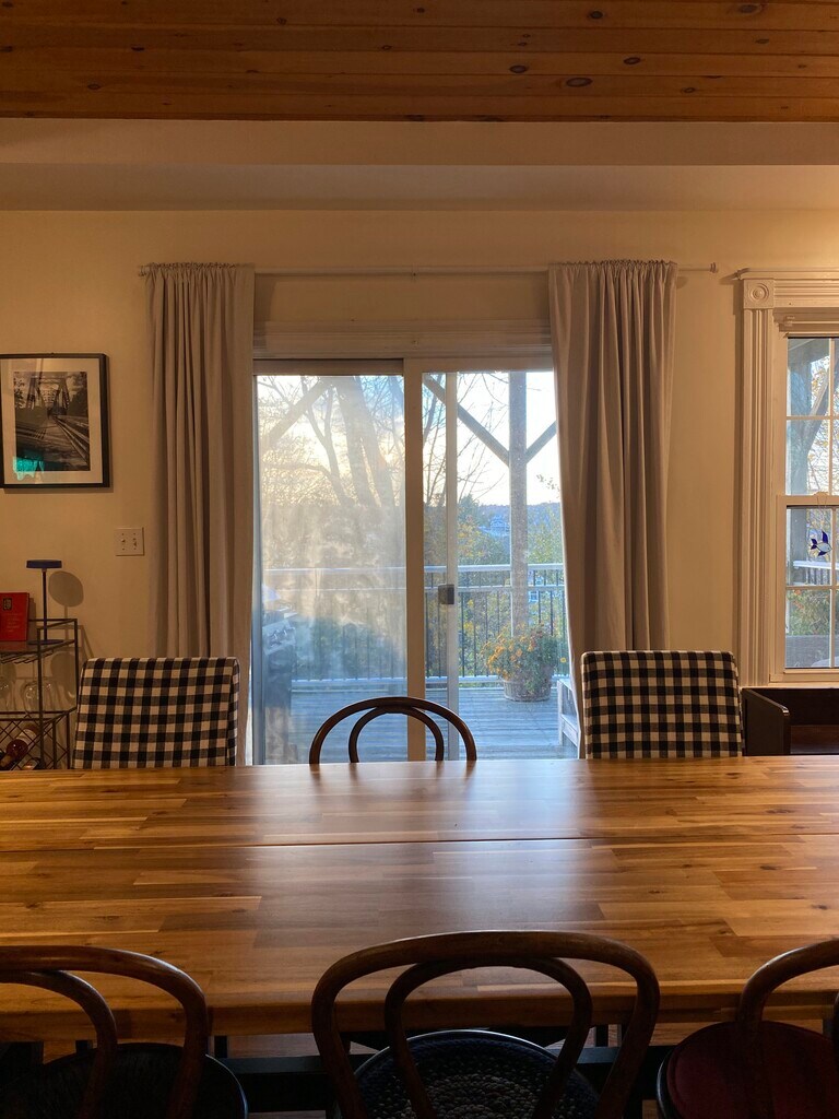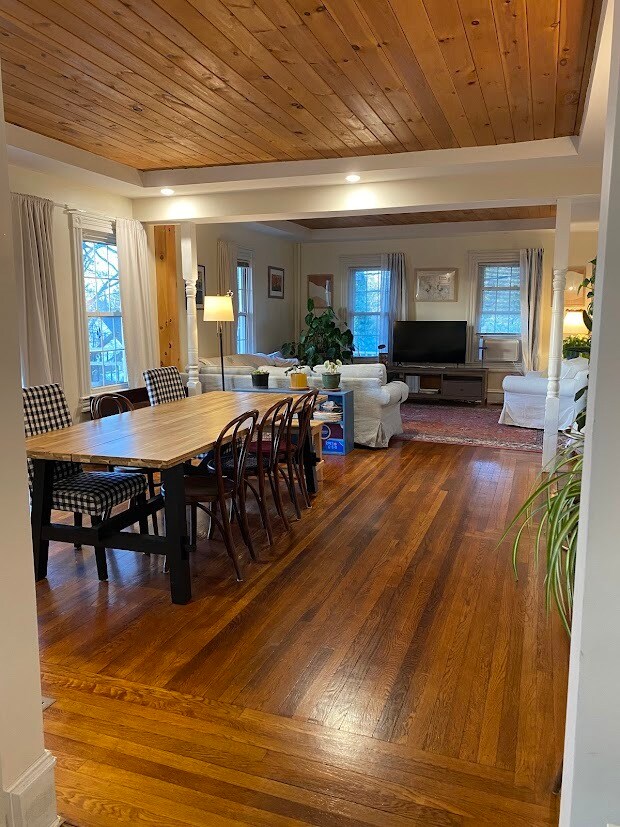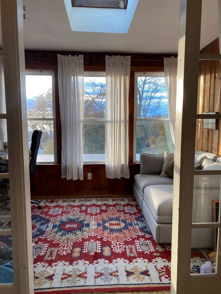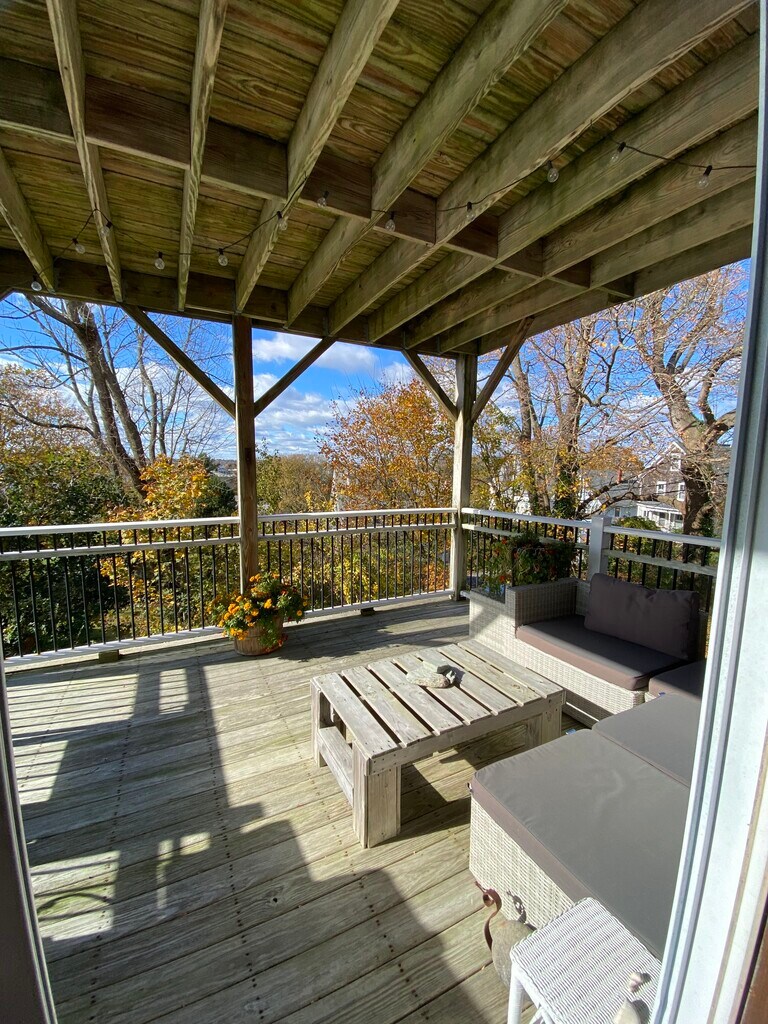 In a salty village along the Sakonnet River in Tiverton, enjoy a vista of the Mount Hope Bridge and local surrounds, walk to Grinnell's Beach and Fort Barton woods trails. Here is easy access, first floor living in a spacious and bright 1,100 square foot apartment in a two-family house. There is one bedroom plus a den, a dining area and an oversized living room with a gas fireplace. The bedroom has a wall of built-in closets and extra storage. The west side deck has gorgeous Western views! Newer kitchen cabs, gas range, dishwasher, large 'fridge and good lighting. Bathroom has some storage and a jet tub. Laundry hook-ups are in the cellar accessed from within. Welcome to your own side entry and mudroom. Water, sewer, yard-care and town trash retrieval are included, noting residents purchase specific trash bags. All showings and applications are through the List Agent. One year lease with security deposit and first month rent must be certified bank checks. Please call or text Lisa.